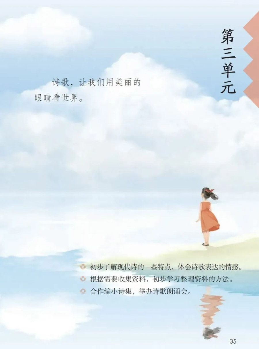 学习诗歌。学习本单元诗歌,结合已有学习经验,初步了解诗歌的特点,想象现代诗的画面美,体会诗人的情感,学习诗人表达情感的方法。通过多形式的诵读,感受文字的韵律美、画面美,从而喜欢上现代诗歌。