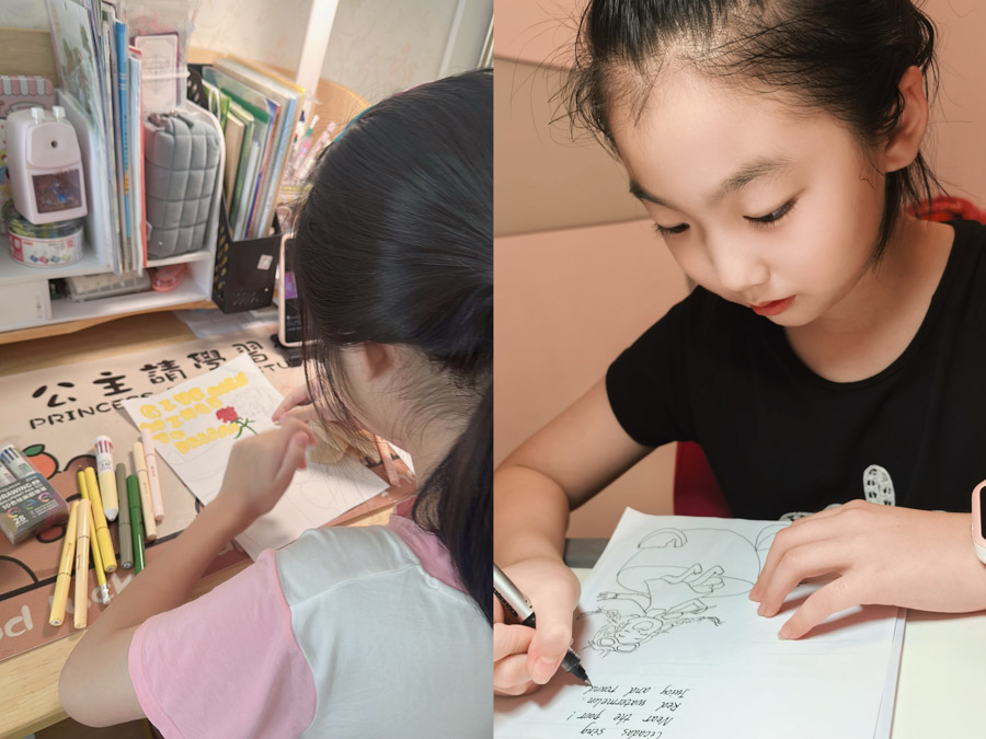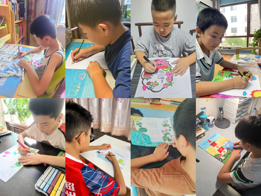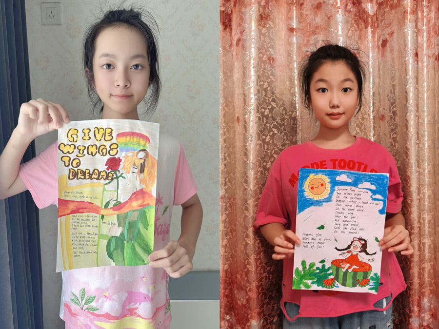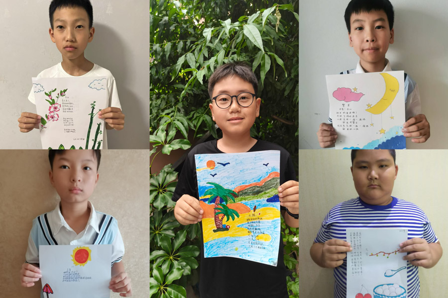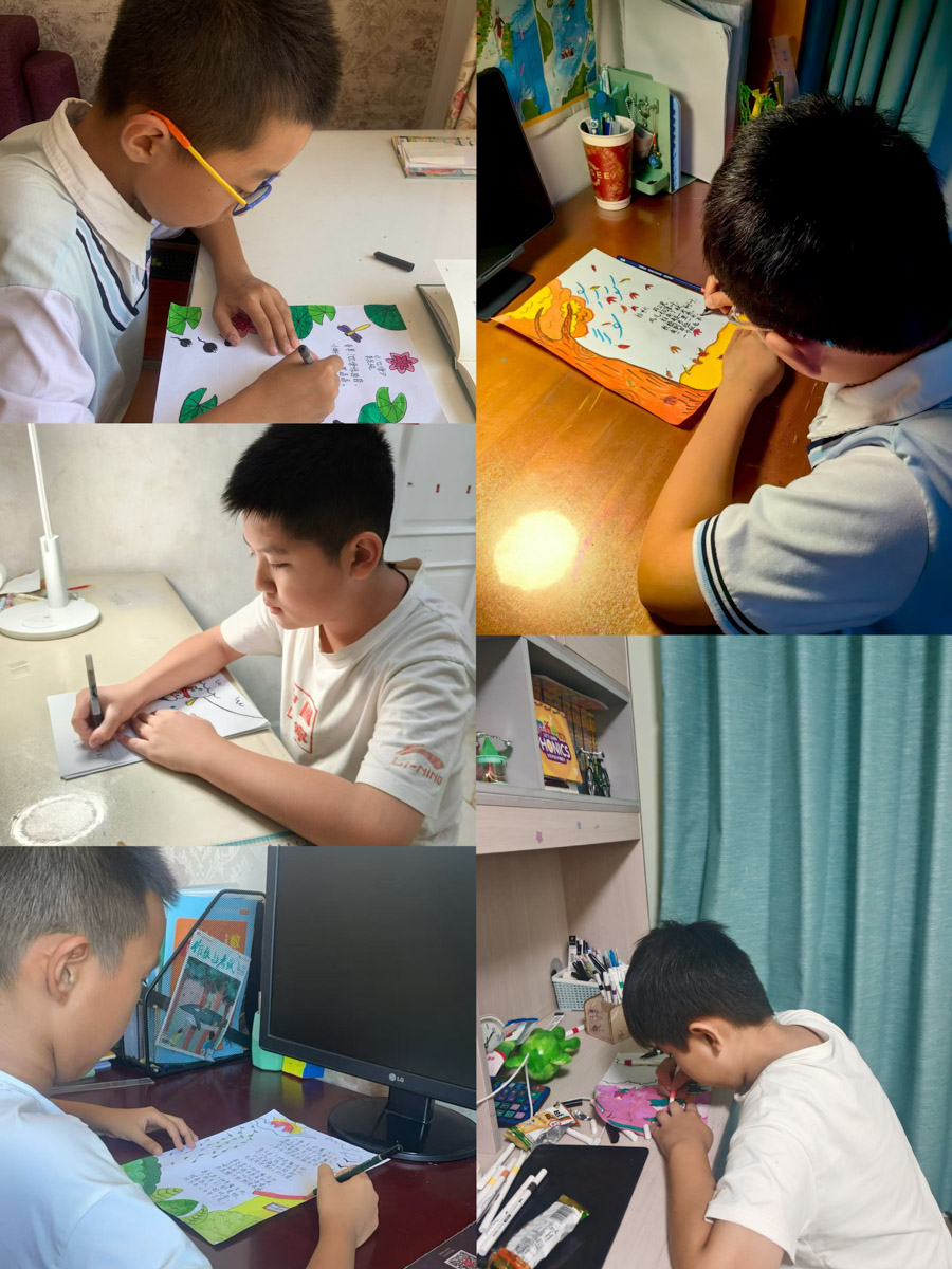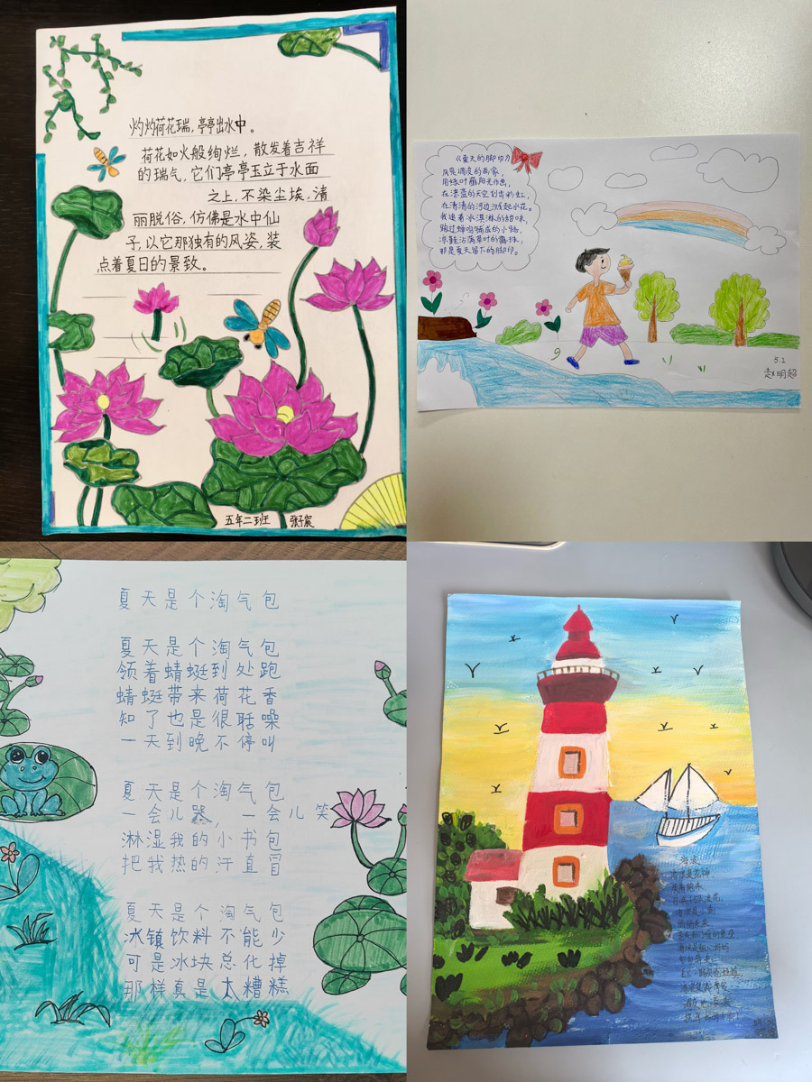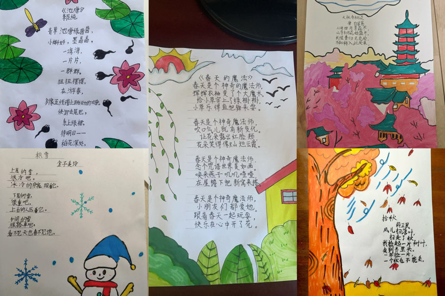 孩子们广泛阅读各类名家现代诗歌作品,从中选择最触动心弦的诗歌,工整地誊写到纸张上,并配上合适的插图,加深对诗歌的感受和体验。让冰心的哲思、艾青的热忱、戴望舒的浪漫在笔尖流淌。创意满满的仿写环节,更是让“诗是无形画,画是有形诗”的美学意境悄然绽放。