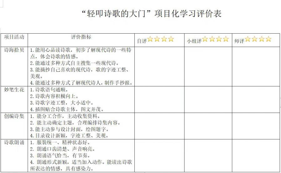 2.构建团队,制定分工表。根据每名同学的长处,划分为资料收集组、诗歌摘抄组、诗歌创编组和诗歌朗诵组。
