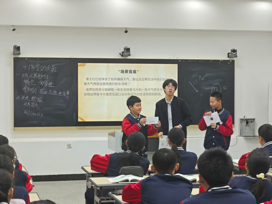 韩典老师的课堂则以近期备受关注的“桦加沙”台风为焦点,用台风过境前后天气变化的视频拉开教学序幕,结合“桦加沙”台风的实时路径图、气象数据,引导学生分析天气的特点及对生产生活的影响,学习天气预报的解读方法、常用天气符号的识别,以及风力、风向的判断技巧。整堂课聚焦现实灾害,围绕真实情境层层设问,引导学生主动探究,在解决实际问题的过程中构建知识体系,提升综合素养。