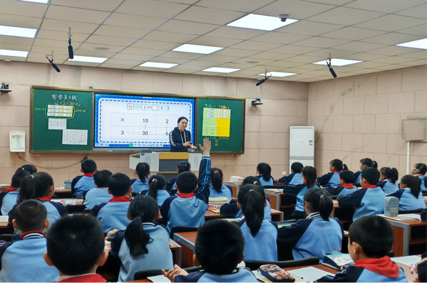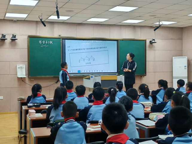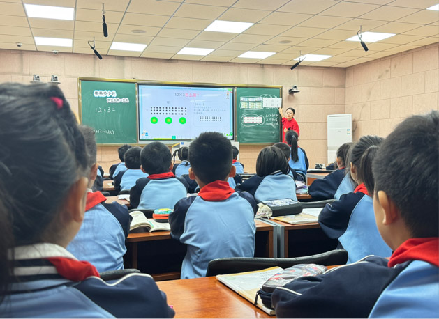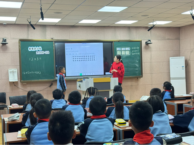 赵晓丹老师以“转化思想”为主线,铺设“生活化→半抽象→符号化”的认知阶梯。通过人民币演示将12×3转化为(10+2)×3的直观过程,在点子图探索中引导学生发现“拆整十数”的简洁性,借助表格提炼算法模型,再通过循序渐进的练习培养学生运算能力这一数学核心素养。整个教学过程环环相扣,实现从具体计算到数学思想的自然升华。