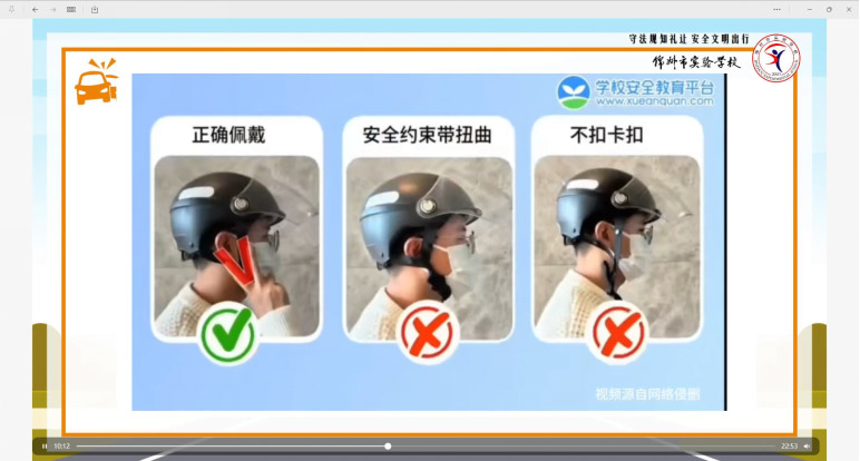 为将“守法规”的要求落到实处,班会重点聚焦于“一盔一带”等与师生日常出行息息相关的交通法规。通过观看科普视频,同学们直观地理解头盔和安全带在意外发生时是如何成为“生命守护神”的科学原理,认识到遵守交通法规绝非小事,而是对生命最基本的敬畏和负责。