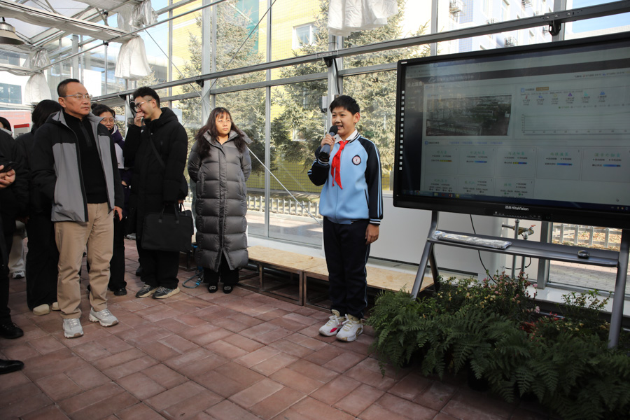 调研团队首先探访智能温室实践基地,沉浸式感受科技赋能科学教育的生动场景。小讲解员介绍,该温室占地312平方米,融合劳动与科学教育,设有环境监测、智能化管理等八大功能模块,践行“做中学、学中研”理念。温室内花卉、蔬菜的生态种植,成为科学与劳动教育落地的鲜活缩影;小志愿者现场演示传感器数据采集、代码编写调控灌溉系统,通过PAD终端精准调节温湿度与光照,直观展现了实验少年扎实的科学素养与实践能力。随后,五年一班、五年二十班的项目化学习团队,分别分享《绿色智慧 锦城良方》《绿动校园·微生态智控温室》探究成果,创新思路与实践能力获嘉宾高度关注。