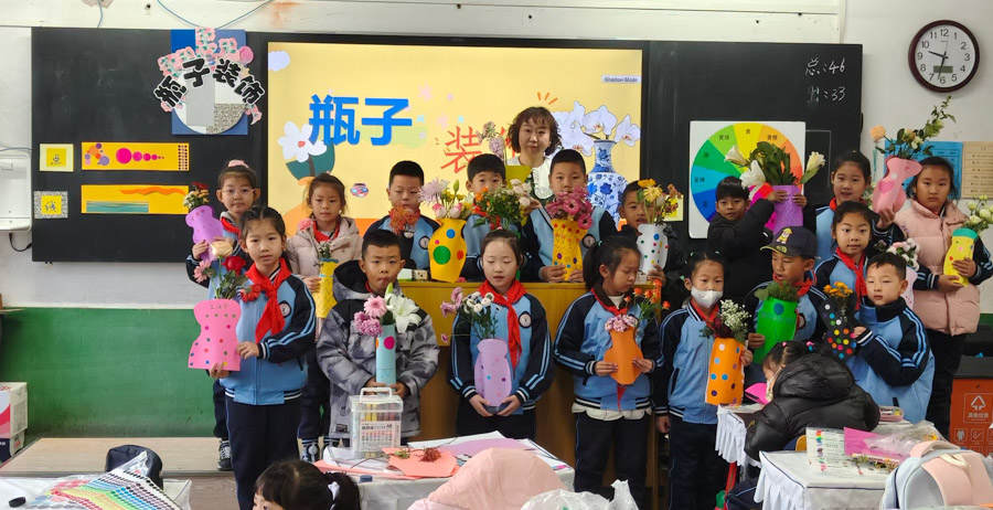 贾一萌老师以“卡纸装饰+插花应用”为教学主线,紧扣“创意实践、生活应用、环保渗透”三大核心,贴合二年级学生具象思维活跃、乐于动手的认知特点,将抽象的“瓶子装饰”转化为具象的“给瓶子穿卡纸衣服”。课堂上,贾老师选用学生生活中随处可见的废旧塑料瓶与易操作的卡纸作为创作材料,通过折叠、剪裁、粘贴等基础操作,降低创作门槛,让学生在游戏式体验中锻炼手部精细动作与空间搭配能力。教学中,贾老师注重生活联结,构建“创作—应用”的完整闭环:前期引导学生发挥想象力,为塑料瓶设计独特的卡纸装饰,培养审美构思与创意表达能力;后期延伸至插花实践,让学生将亲手制作的花瓶用于实际插花,直观感受美术作品“既好看、又好用”的实用价值,深刻体会“艺术源于生活、服务生活”的理念。同时,以废旧物品再利用为切入点,自然渗透环保教育,引导学生建立“废弃物≠垃圾”的认知,在创作中实现艺术素养与环保意识的双重提升,切实落实“美劳结合、知行合一”的教学目标。