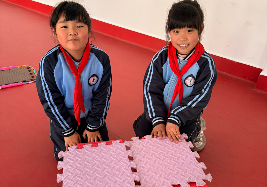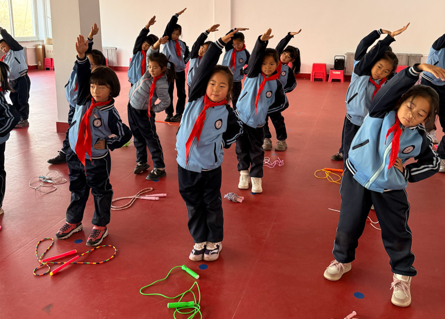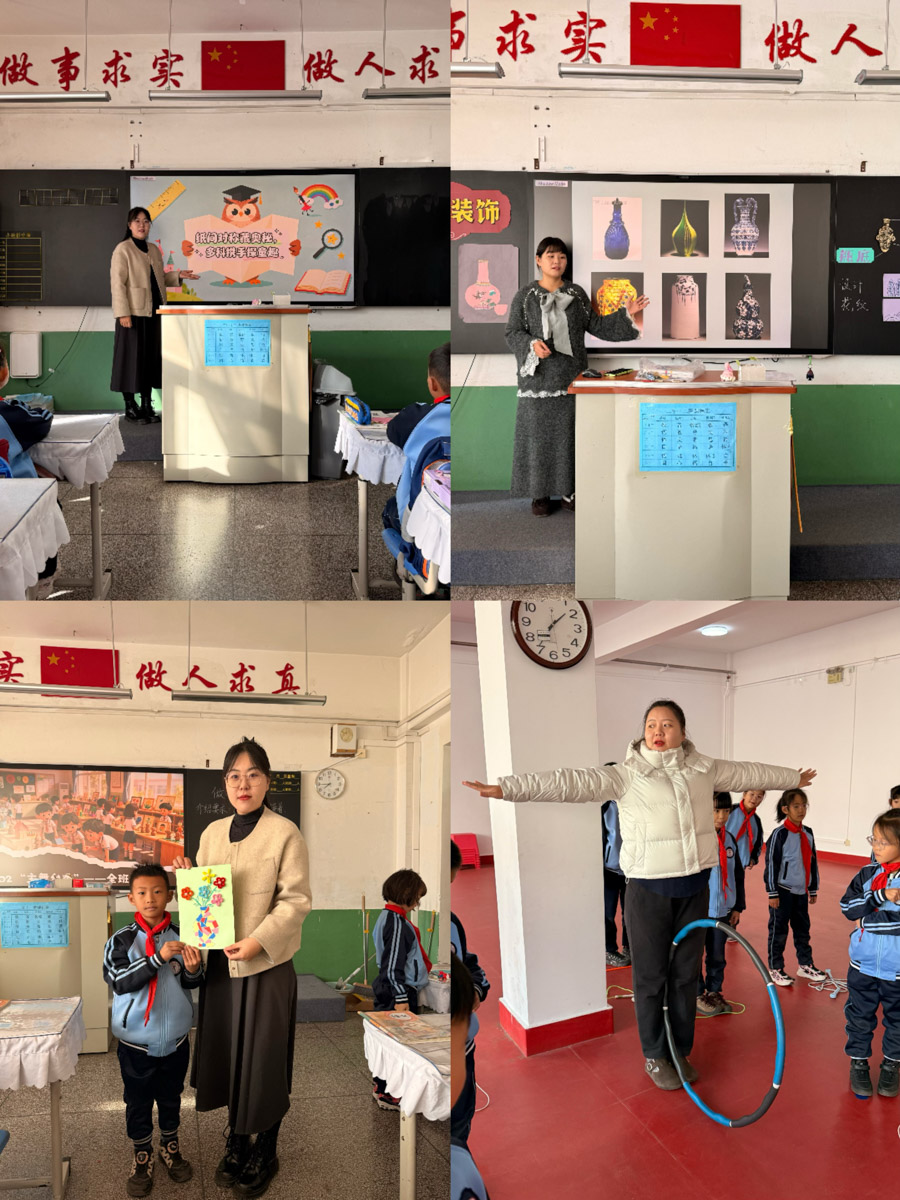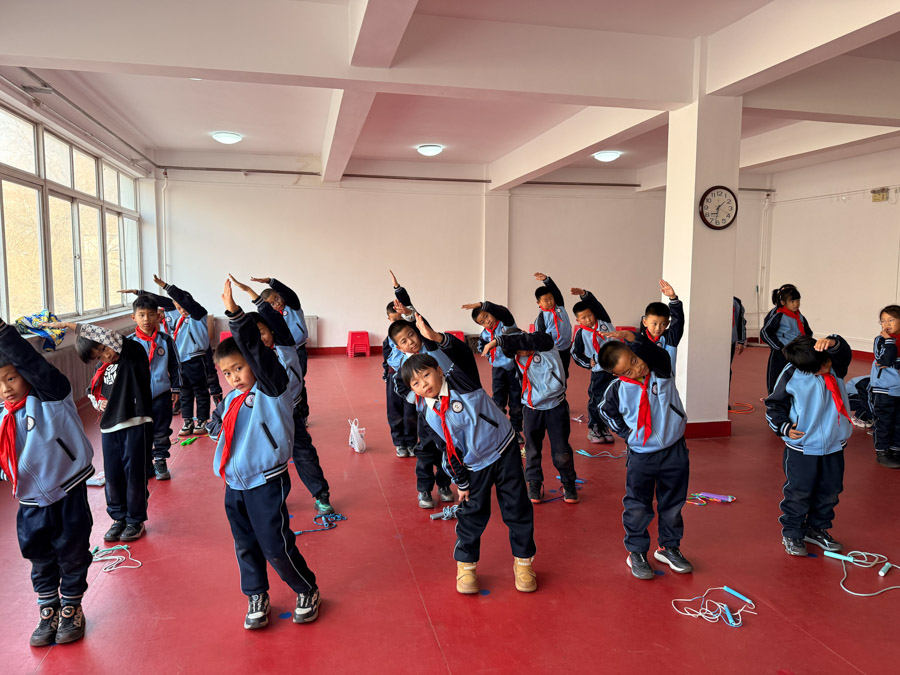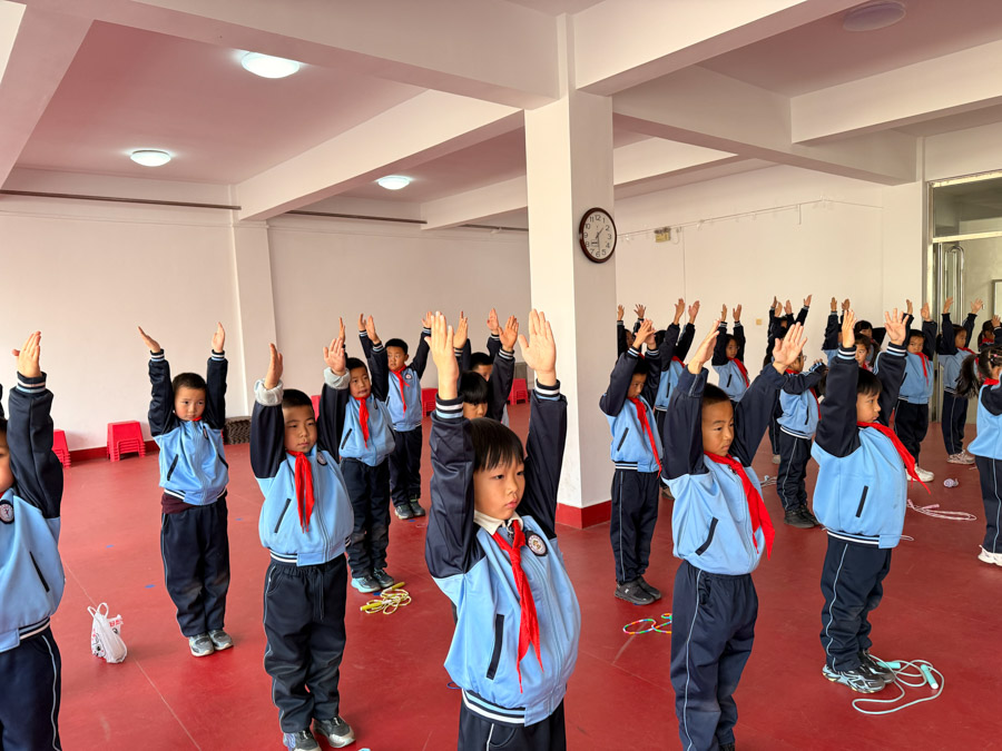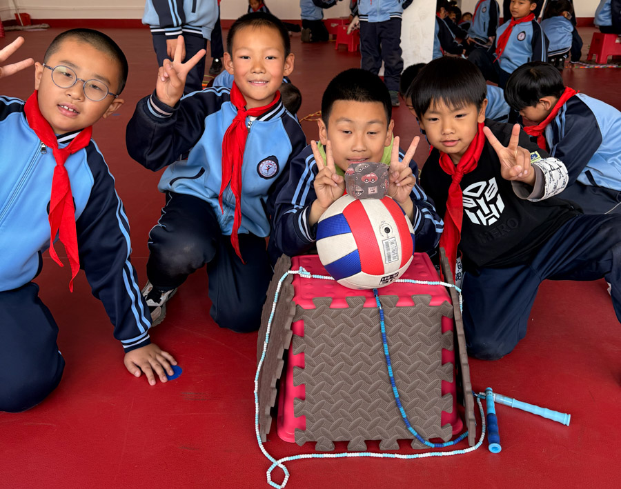 体育课堂则把对称学习变成了一场动感小游戏!热身时,孩子们跟着老胡盈盈老师做动作,模仿镜子里的对称身影,直观感受到了身体的对称美;“器材对称找朋友”环节,大家拿着跳绳、羽毛球拍,认真找起了它们的对称轴;“对称图案大挑战”中,有的同学用跳绳摆出漂亮的对称图案,有的小组合作搭出大型对称造型,既锻炼了空间想象力,还学会了和小伙伴配合;“穿越对称之门”游戏里,孩子们摆出双臂侧平举、双手合十跳跃等对称动作闯关,在欢声笑语中提升了身体协调性和平衡能力。