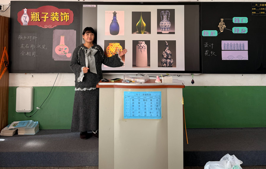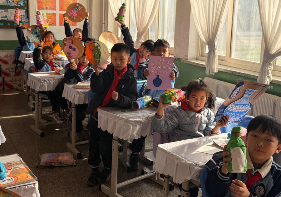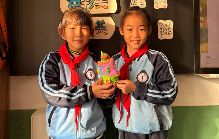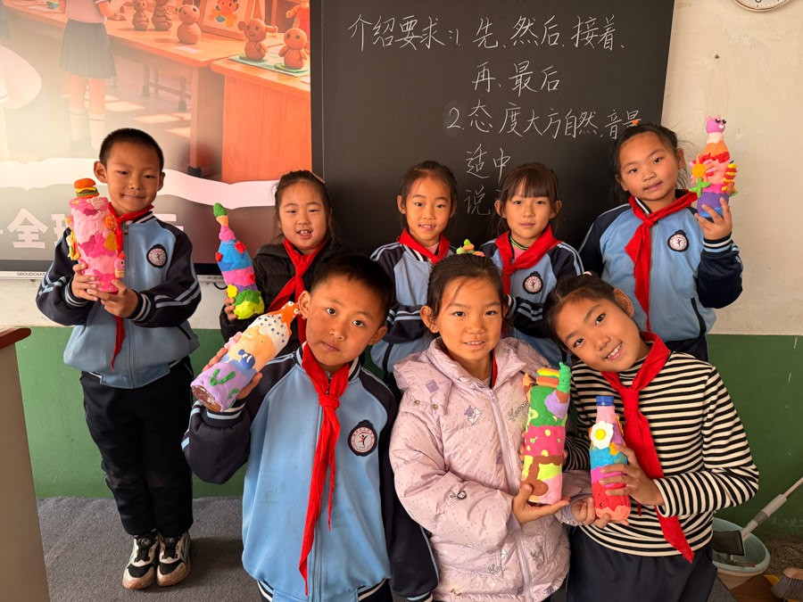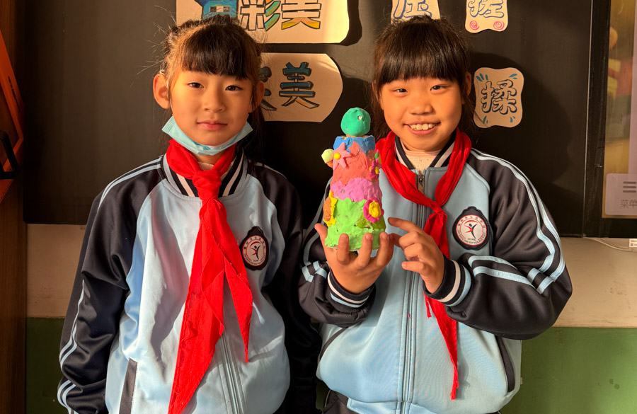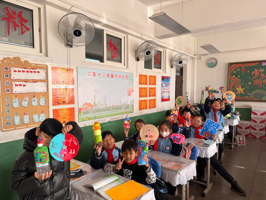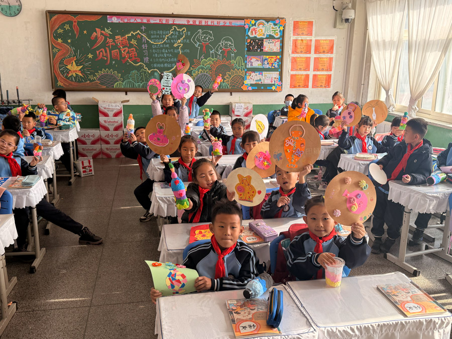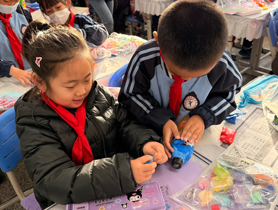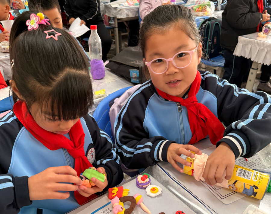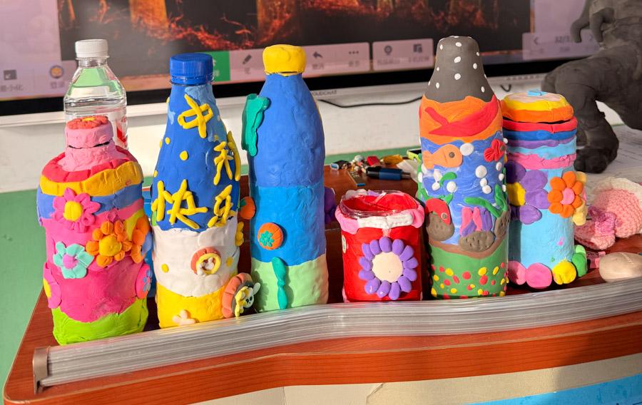 数学课堂学到的对称小知识,瞬间点燃了孩子们的创作热情!美术课上,杨旭老师带领着同学们运用刚学的本领,开启了“七彩对称花瓶”和“黏土瓶子改造”两大创作任务。他们先用“对折裁剪”的方法做出对称的瓶身,再用彩纸、扭扭棒细心装饰;之后又拿起废旧瓶子,用黏土捏出各种对称造型,把抽象的对称概念,变成了一个个色彩鲜艳、创意满满的小作品。