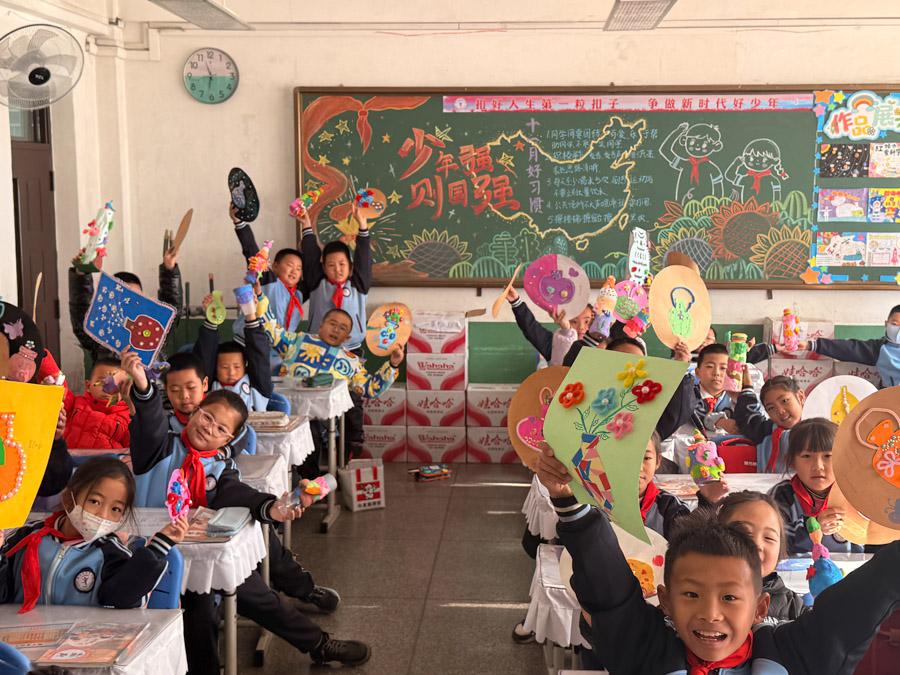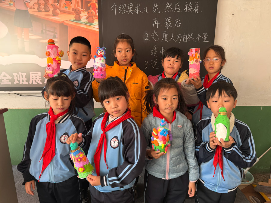 语文课上,超有趣的“巧手电视台”正式开播!孩子们轮流变身“小嘉宾”和“小记者”,在“个人专访间”里两两搭档,用“先、然后、接着、最后”这些顺序词,把自己作品的名字、用的材料和制作步骤说得明明白白;“主舞台秀”环节,大家自信地举起作品,分享自己的创作小思路;“观众热线”一开通,现场更热闹了,小观众们积极提问、真心赞美小伙伴的作品。在轻松欢乐的氛围里,孩子们不仅会做手工,还学会了清晰表达,实现了从“会做”到“会说”的小飞跃!