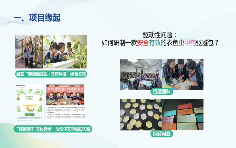 《绿色智慧·锦城良方》项目源于学生发现衣鱼虫侵蚀书籍的真实问题。项目团队围绕驱动性问题“如何研制一款安全有效的衣鱼虫中药材驱避包?”展开了为期八周的跨学科探究。亲历完整科学流程,优选出驱虫“最佳配方”。
