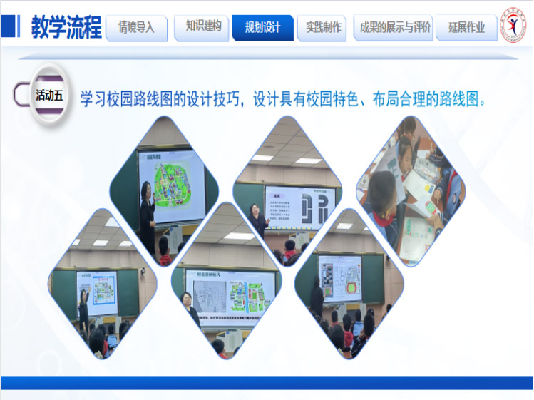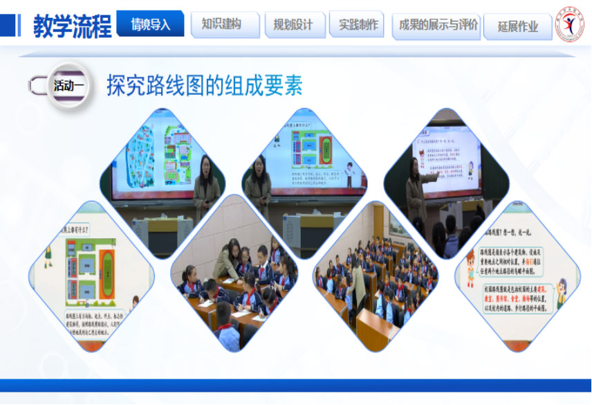 学生以小组为单位,通过资料查找、了解路线图的构成要素,学习关于方向的相关知识,并设计、制作各种各样有创意的校园路线图。