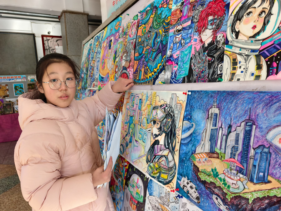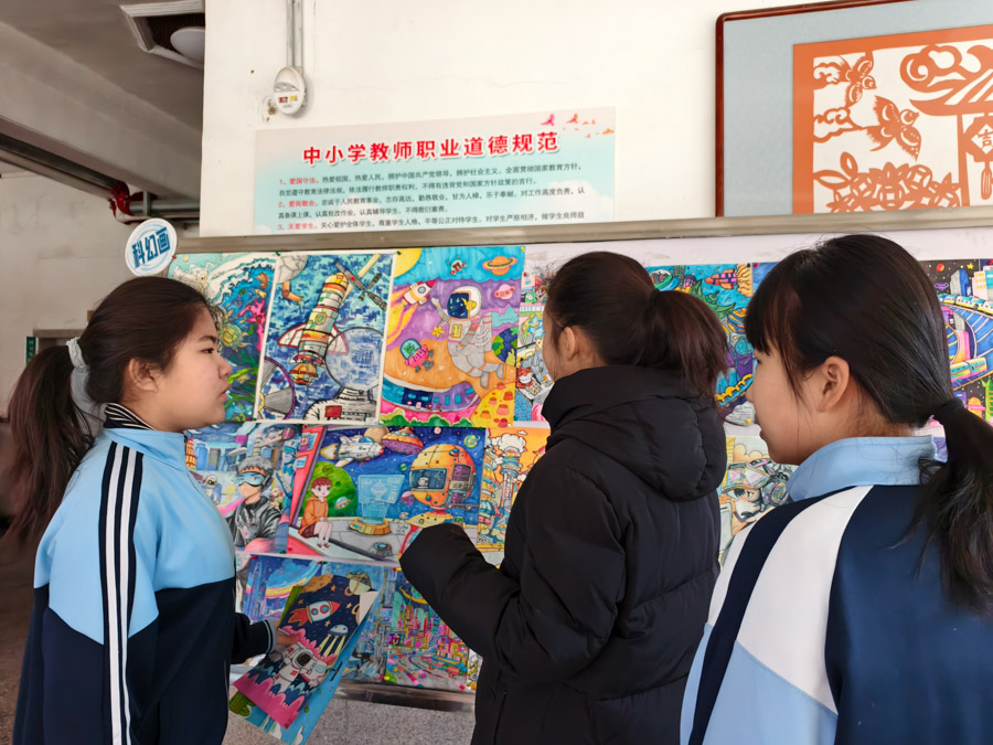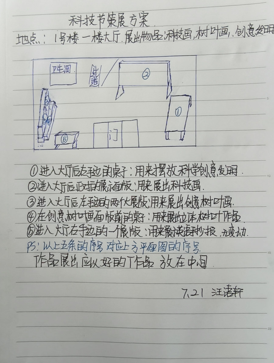 七年级学生会同学从前期征集作品、手绘展览效果图、规划“树叶画”、“科幻画”与“科技创新发明”三大展区到设计展台、制作说明标签,直至现场引导讲解,充当了全部流程的实施主角。他们巧妙利用空间,将创意画与实物模型错落搭配,使整个展区既充满科技感又不失活泼。