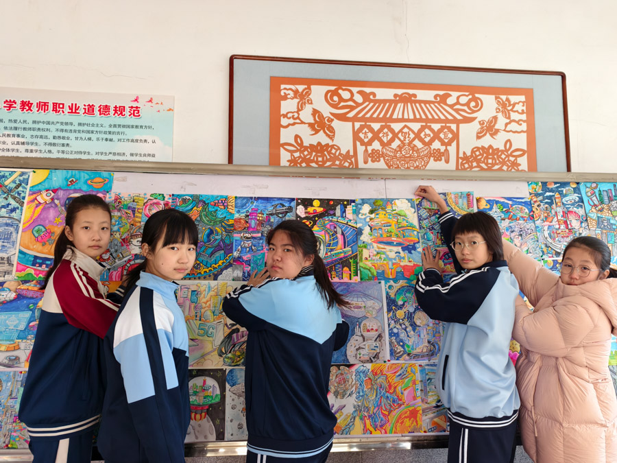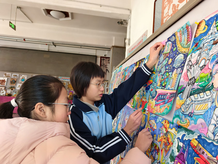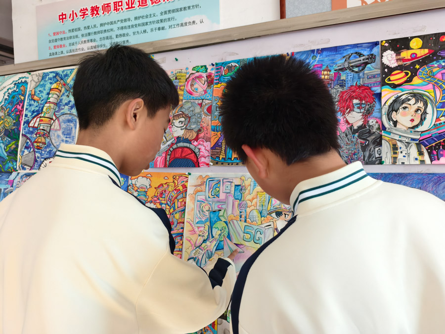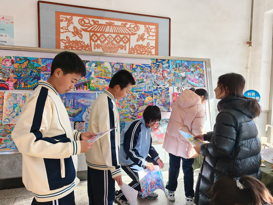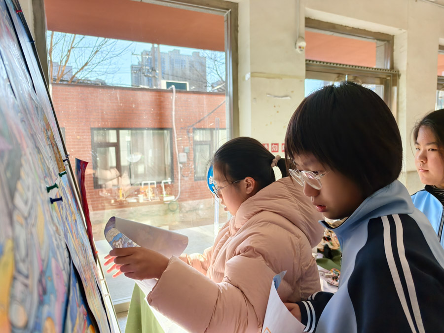 “看到同学们热情、认真欣赏我们的布展,讨论作品细节,感到特别有成就感。”参与策展的学生会成员七年二十七班徐逸珊笑着说。