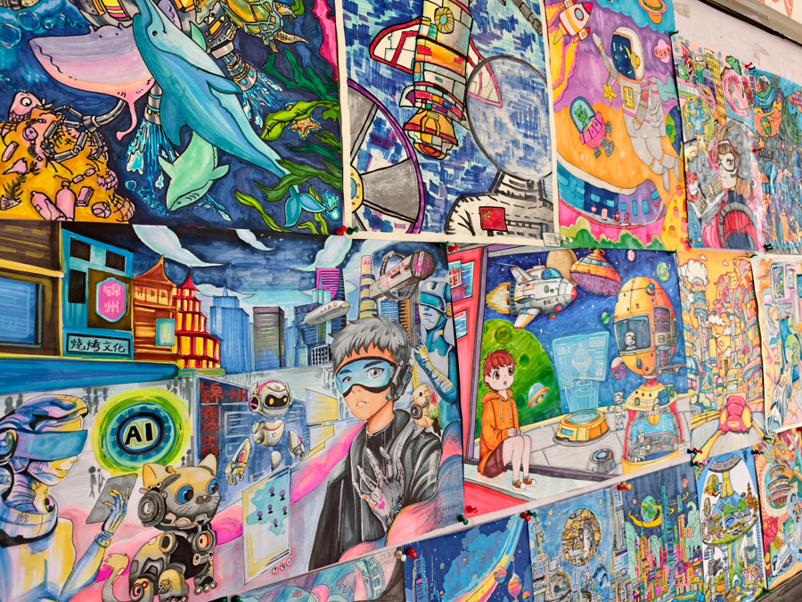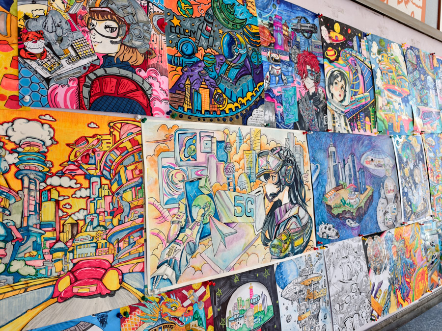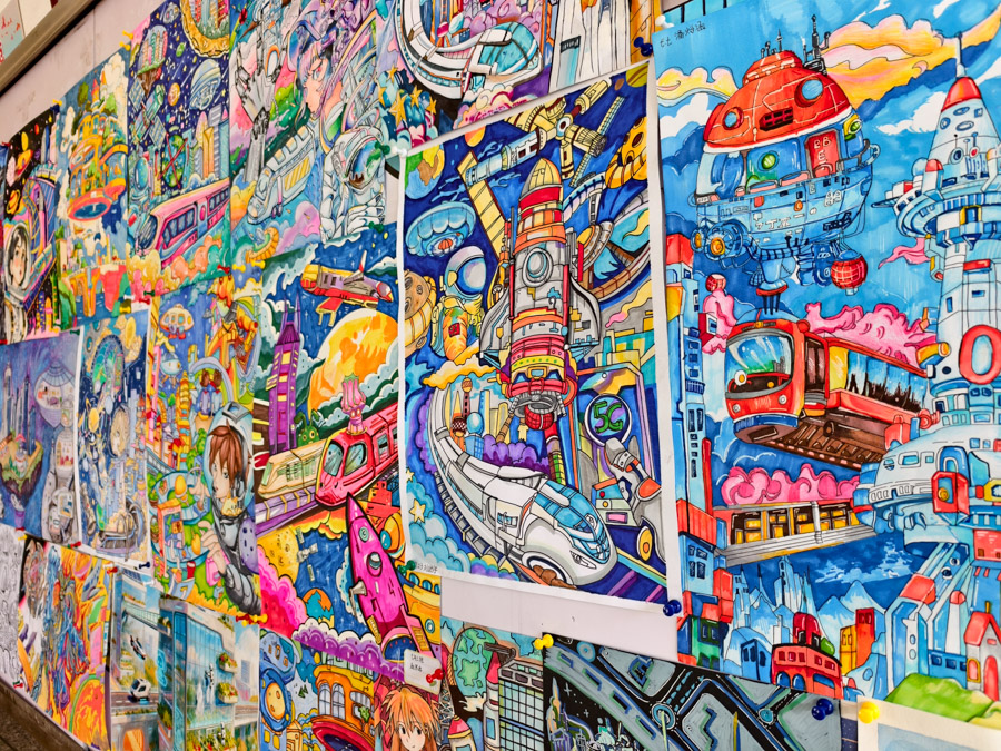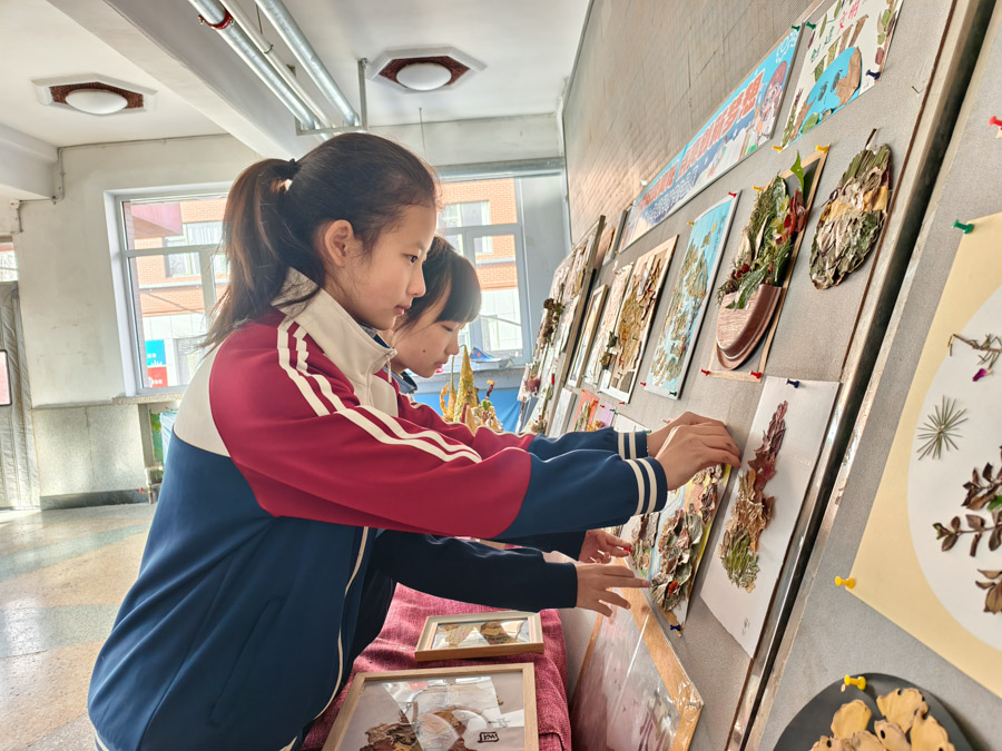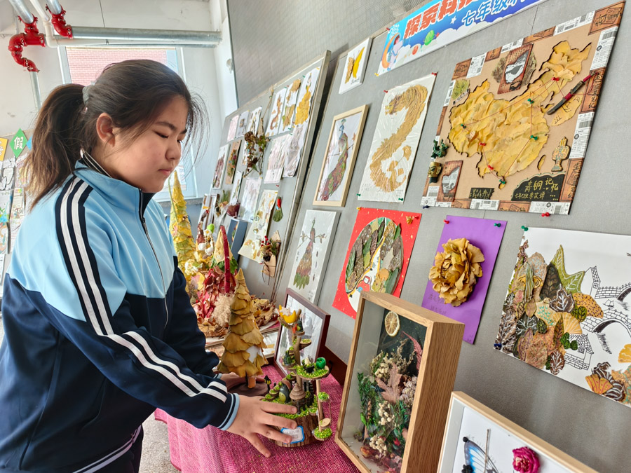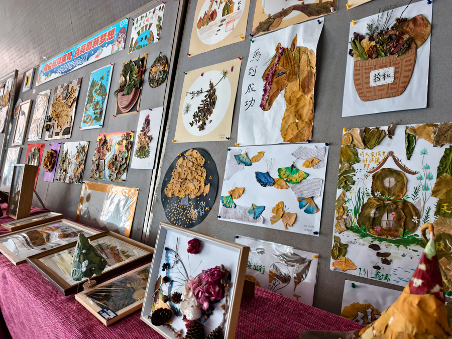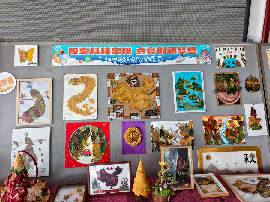 展览汇聚七年级百余件学生作品,包括精巧的树叶画、构想未来的科技创意画以及源自生活的小发明、小创造,充分展现了七年级学生的巧思与探索精神。