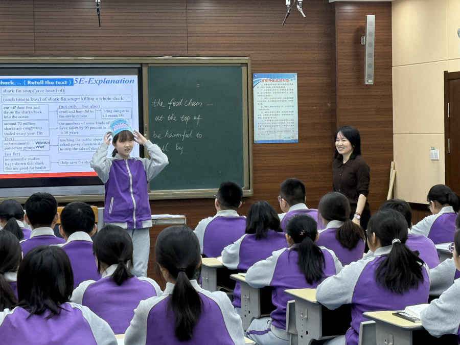 王艺儒老师:“张萍萍老师课堂中环保主题的延伸设计尤为出彩,从鲨鱼保护拓展到华南虎、朱鹮等濒危动物,再到三江源生态保护,让学生的视野从课本走向生活,真正实现了 “立德树人” 的教学目标,让英语课堂有温度、有深度。小组合作环节设计情境合理,学生在讨论 “如何保护鲨鱼” 时积极思考、主动表达,充分体现了学生的主体地位。若能在小组展示环节增加互评环节,将更能提升学生的评判性思维能力。”