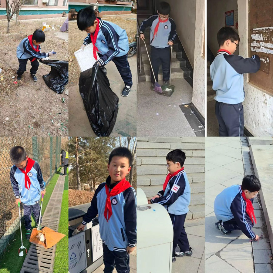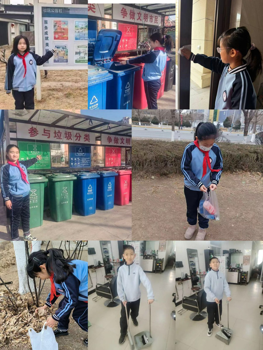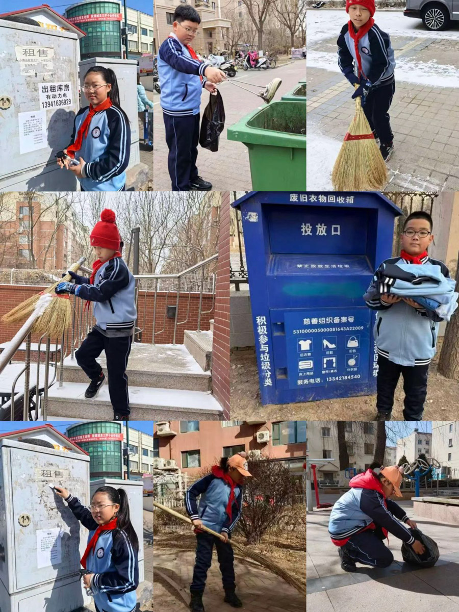 清洁小分队:负责打扫社区里的卫生,并进行垃圾分类宣传。大家干得热火朝天,有的打水,有的擦洗灰尘,有的捡拾垃圾。虽然抹布很冷,水也很凉,但看到小区的环境干净整洁,孩子们的心里暖洋洋的。