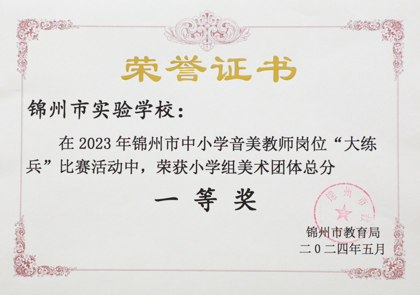 2023年 在2023年锦州市中小学音美教师岗位“大练兵”比赛活动中,荣获小学组美术团体总分一等奖