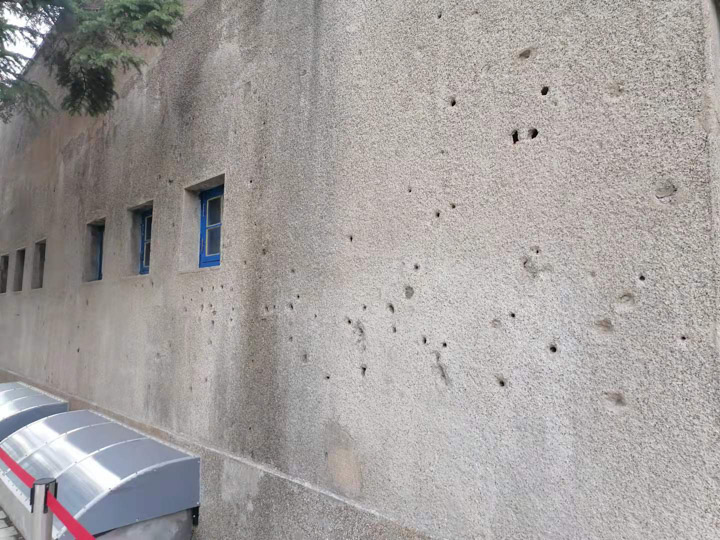 队员们拾阶而上,仿佛冲顶当年战斗的高地。他们来到建筑遗址“红房子”跟前,这里虽然经过翻新整修,但旧貌依旧保留,在东墙上,弹痕累累,清晰可见。耳畔似乎能听到轰轰烈烈的枪声。队员们都安静严肃起来,静静的思考。