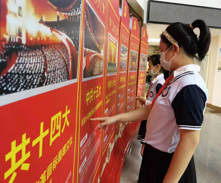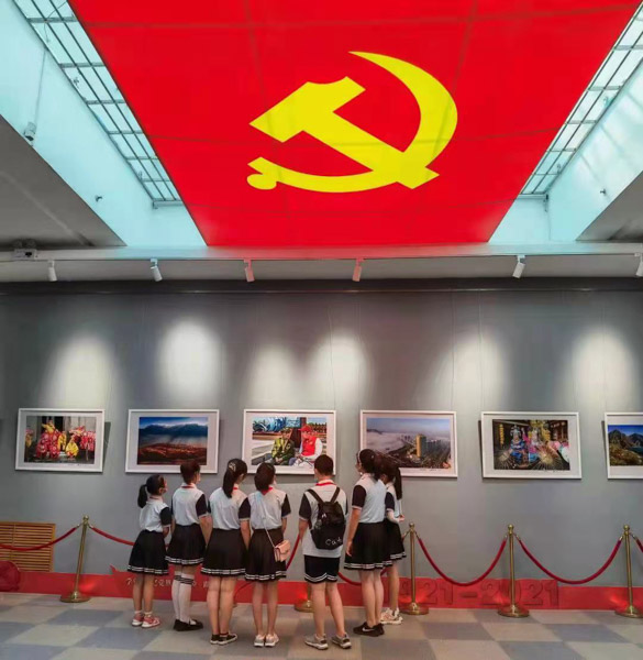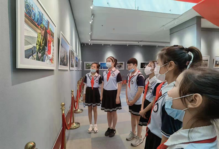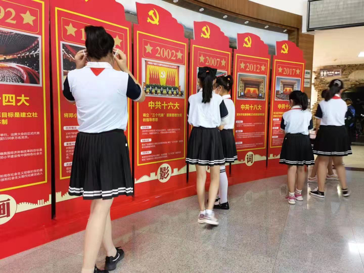 从石库门到天安门,从兴业路到复兴路,从小小红船到巍巍巨轮。在长征精神、延安精神、西柏坡精神、抗疫精神、脱贫攻坚精神等伟大精神的指引下走过了从建党的开天辟地到领导人民的改天换地,到领航中国的翻天覆地,到新时代强国大业的惊天动地的奋斗历程。小队员们驻足于一幅幅照片前,讨论着、思考着。