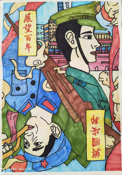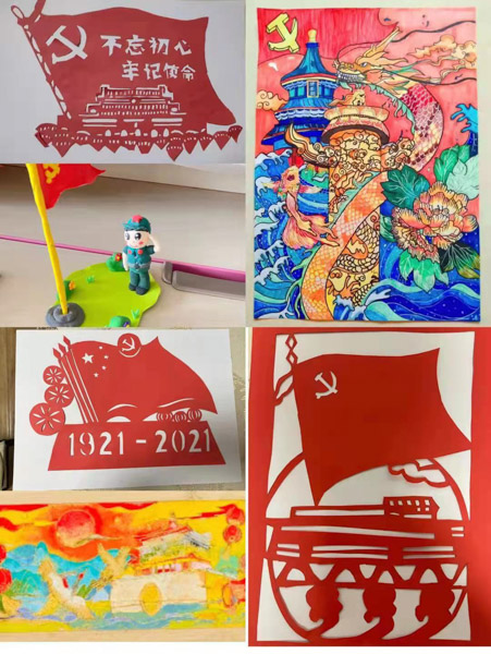 党的光辉历程,奋斗精神浸润着队员的心,参观结束后,队员们利用手中的纸和剪刀,紧扣建党百年主题创作多幅剪纸艺术作品;大胆构思,创作出一幅幅主题鲜明、色彩丰富的书法、绘画作品。表达对中国共产党和伟大祖国的满腔挚爱,凝聚起奋发向上的力量。