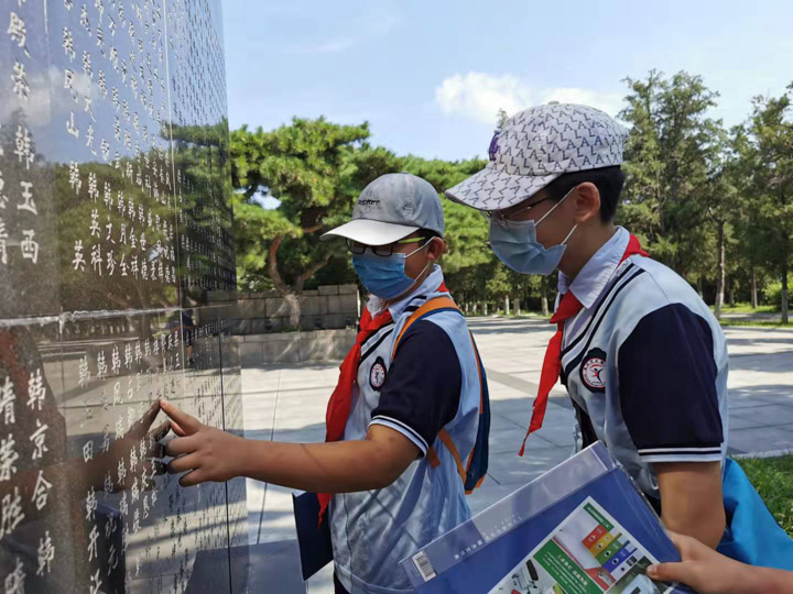 队员们来到烈士名录墙前,这里铭刻着47100多位当年牺牲的烈士英名,他们用手轻轻地抚摸这花岗岩板上烈士英名,表情变得严肃而凝重,心中泛起阵阵涟漪。