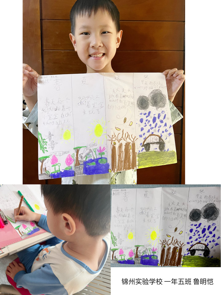 司昊轩说:今天我用画笔画下春夏秋冬。春天到了,小燕子从南方飞回来了,柳树的枝条长出了绿芽,春暖花开是形容春天的成语。荷花在夏季开放,夏季比较热,还经常下大雨。我喜欢夏天,是因为夏天可以去海边玩。秋天......