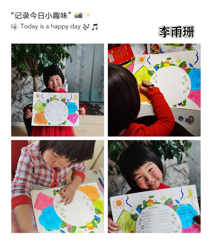 何易宸说:一年有四季,我最喜欢的是春天,因为到了春天,天气一天天的变暖,冰雪融化了、小树发芽了、小草变绿了、小花绽放了、小动物们也都结束了冬眠,纷纷跑出来了。这让我想起了一首苏轼的古诗《惠崇春江晚景》,里边写到“竹外桃花三两枝,春江水暖鸭先知,蒌蒿满地芦芽短,正是河豚欲上时”。这首诗里我最喜欢第二句话,因为里边有水,有小鸭子。我和妈妈通过查看资料和网络搜索,最终决定用绘画的形式将这句话描绘出来。我画了蓝色的江水,岸上的柳树长出了枝芽,小草已经变绿,草地上还有漂亮的小花,三只小鸭子有的在水里游泳,有的在岸边喝水,还有的在草地上玩耍。我开始画小鸭子总是画不好,通过在网上搜索,仔细观察别人是怎么画的,终于画出了可爱的胖胖的小鸭子。通过这次活动,我发现了春天的美,也发现了语言的美,对语文更加感兴趣了。