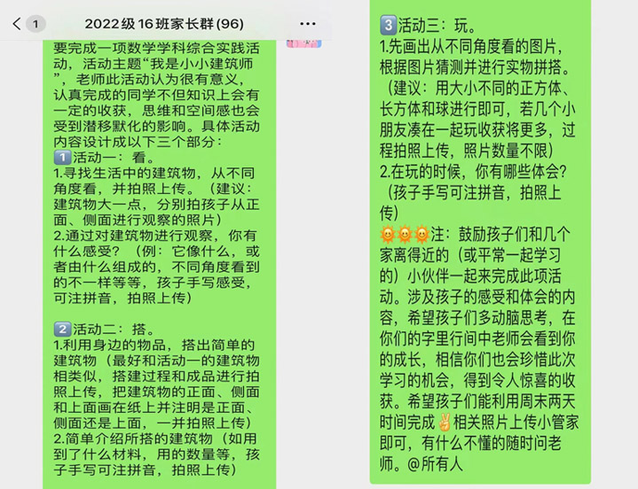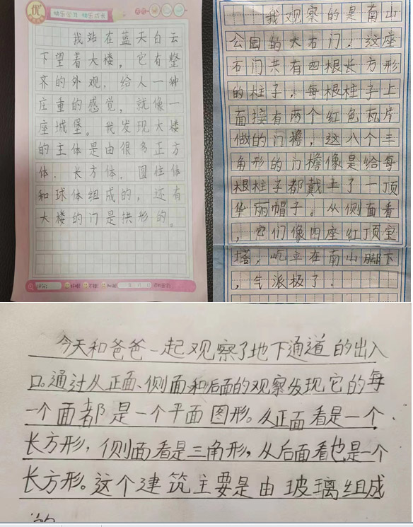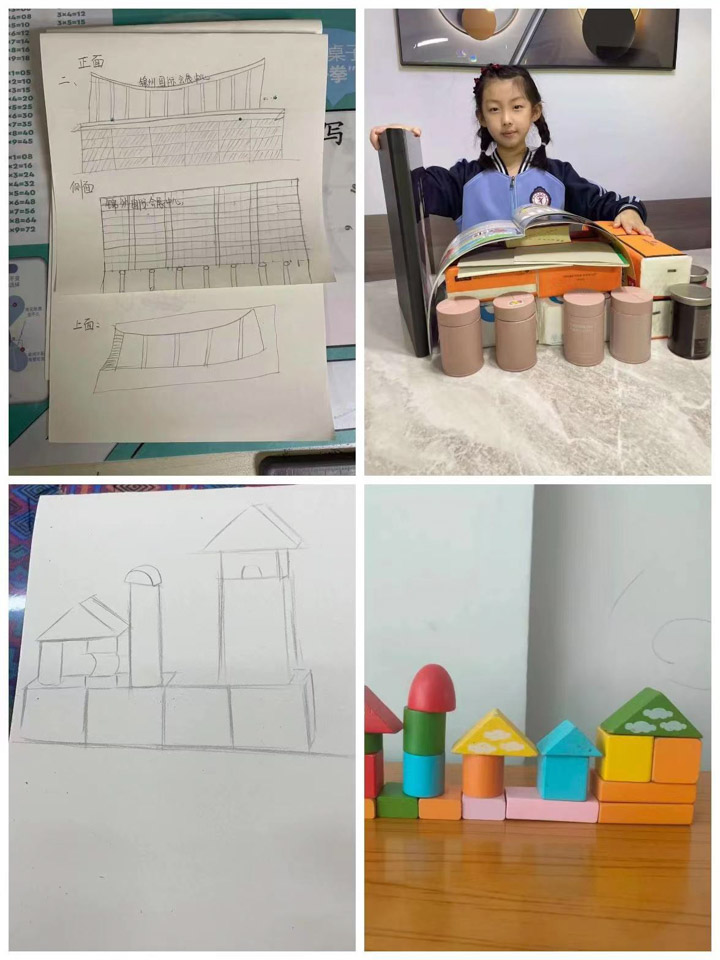 观察物体是学习空间与图形知识的必要基础,对于帮助学生建立空间观念,培养学生的空间想象能力有着不可忽视的作用。为了培养孩子们的观察能力,动手能力和空间想象力,2022级16班开展了以“我是小小建筑师”为主题的数学学科综合实践活动。任务布置下去后,孩子们都很感兴趣,家长们也是大力支持,有的特意带孩子去观察了有特点的建筑物;有的立刻让孩子观察了家旁边的建筑物;有的一边在路上一边观察研究了起来。活动不仅让孩子们动起来了,而且学到了。让我们通过孩子们那双智慧的眼睛来观察各种各样的建筑物!