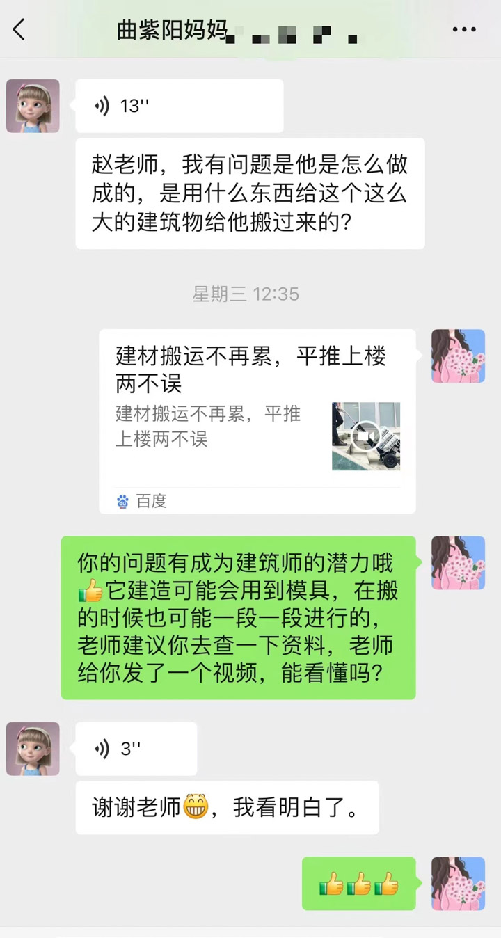 方梓熙在把亭子柱子搭好以后,遇到了亭子顶的封不上的问题。在老师的建议下他尝试调换积木方向,朝向不同的方向拼搭,知道要找准重心才能搭稳。最后,在爸爸妈妈的帮助下,经过多次尝试,终于把亭子搭成功了!