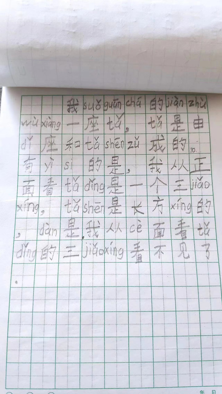观察建筑物后,孩子们在家长的帮助下,一边查字典,一边组织语言,孩子们把观察到的体会写在了本子上。通过书写体会,孩子们的语言表达能力以及书写能力都得到了锻炼。