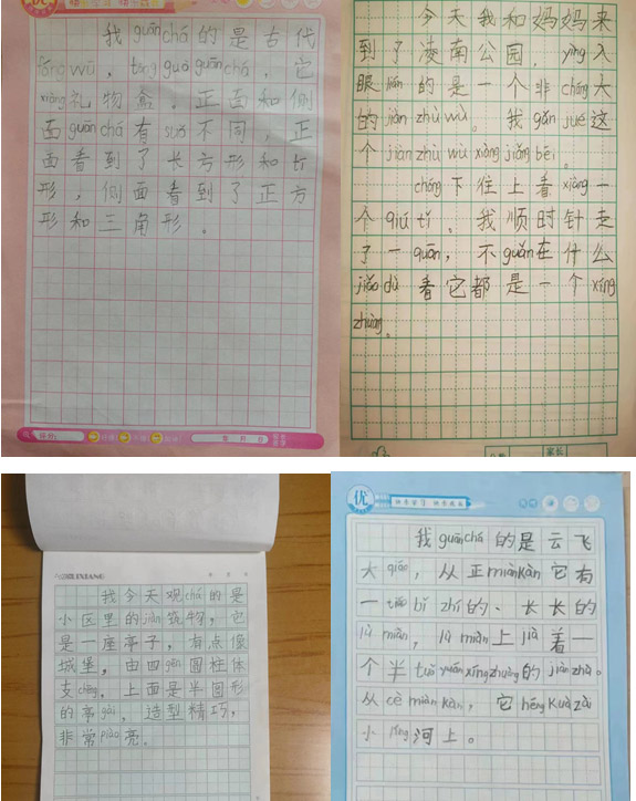 横看成岭侧成峰,远近高低各不同。通过这次实践活动让孩子们懂得了从不同的角度观察建筑物会有不同的结果,也让孩子们明白了只有多动手多观察,才能不断提高自己的想象能力,更让孩子们在实践的经历中有了自己的想法和观点。他们收获的不仅是学习数学的兴趣,还树立了学习数学的信心。