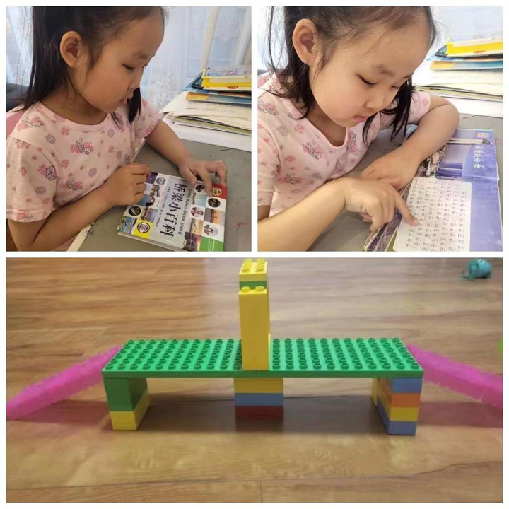 然而,搭建的过程并不是那么顺利,李妍熙在搭建大桥的活动中,不知道桥梁怎么搭才能不倒,在查阅书籍中学习了简单的桥梁搭建知识,最后用积木块做立柱解决了这个问题。