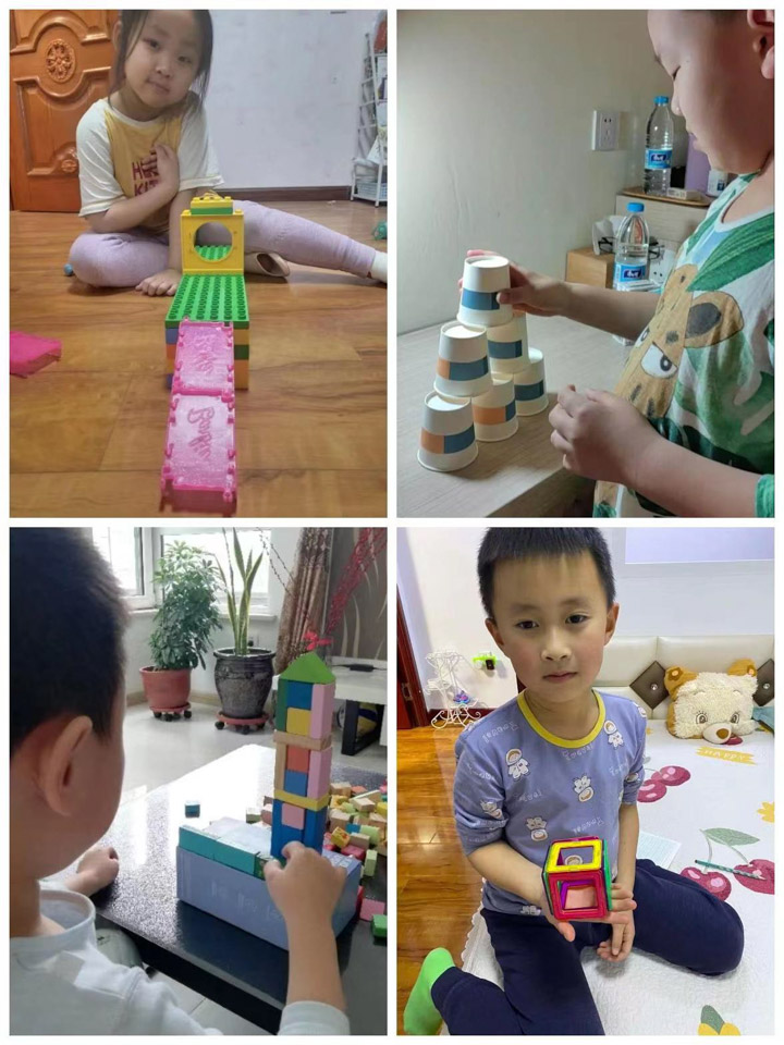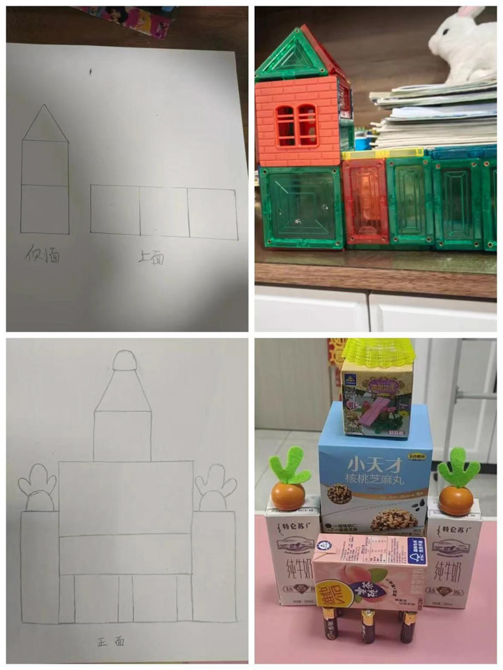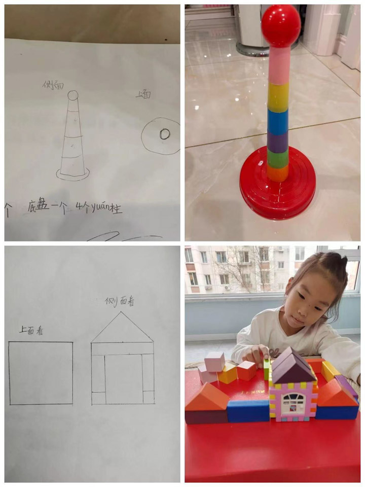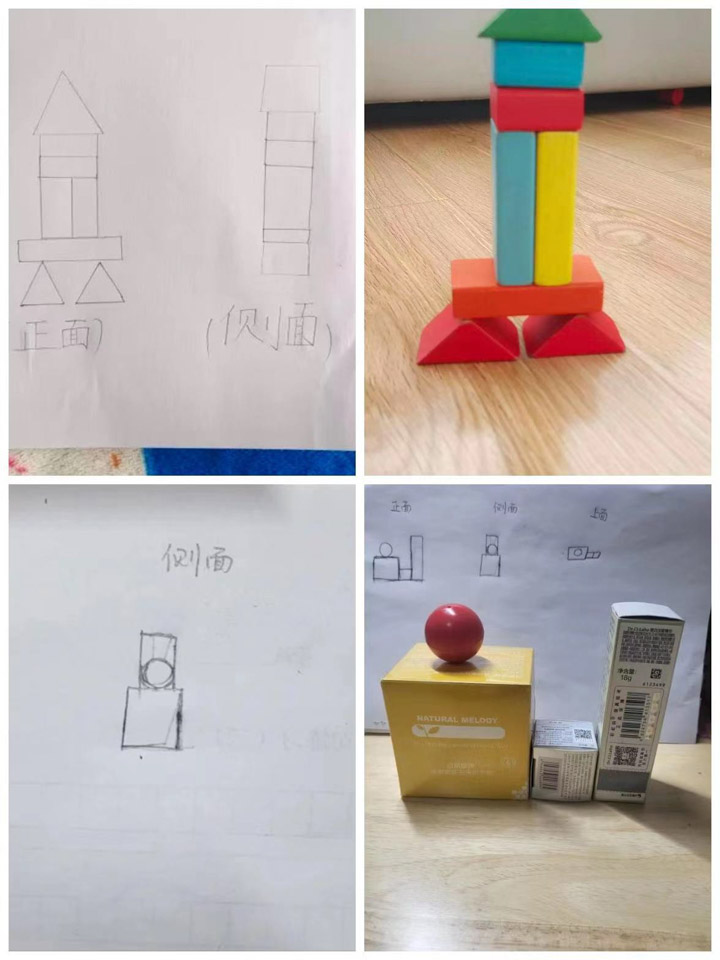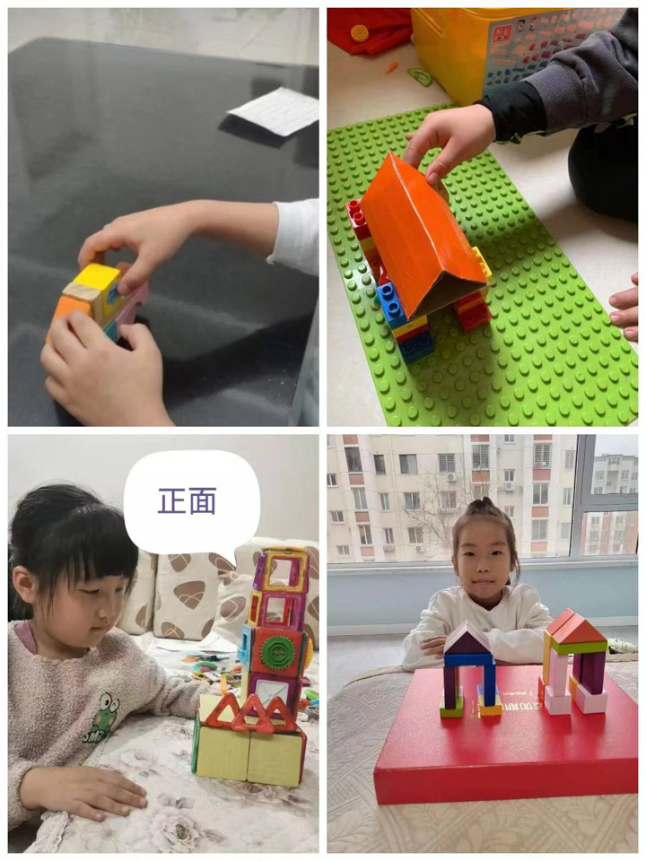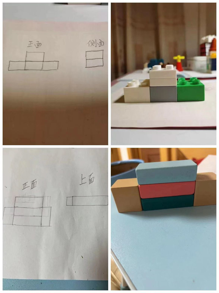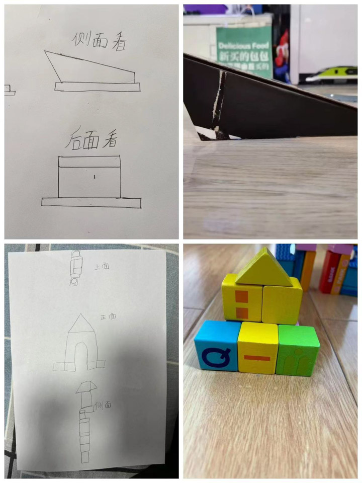 根据活动的设计,孩子们接受了来自爸爸妈妈的小挑战。爸爸妈妈提前画出的从不同角度看到的图,孩子们来进行实物的拼搭。此活动没有难倒他们,反而越战越勇,孩子们的空间想象能力得到了充分地锻炼!