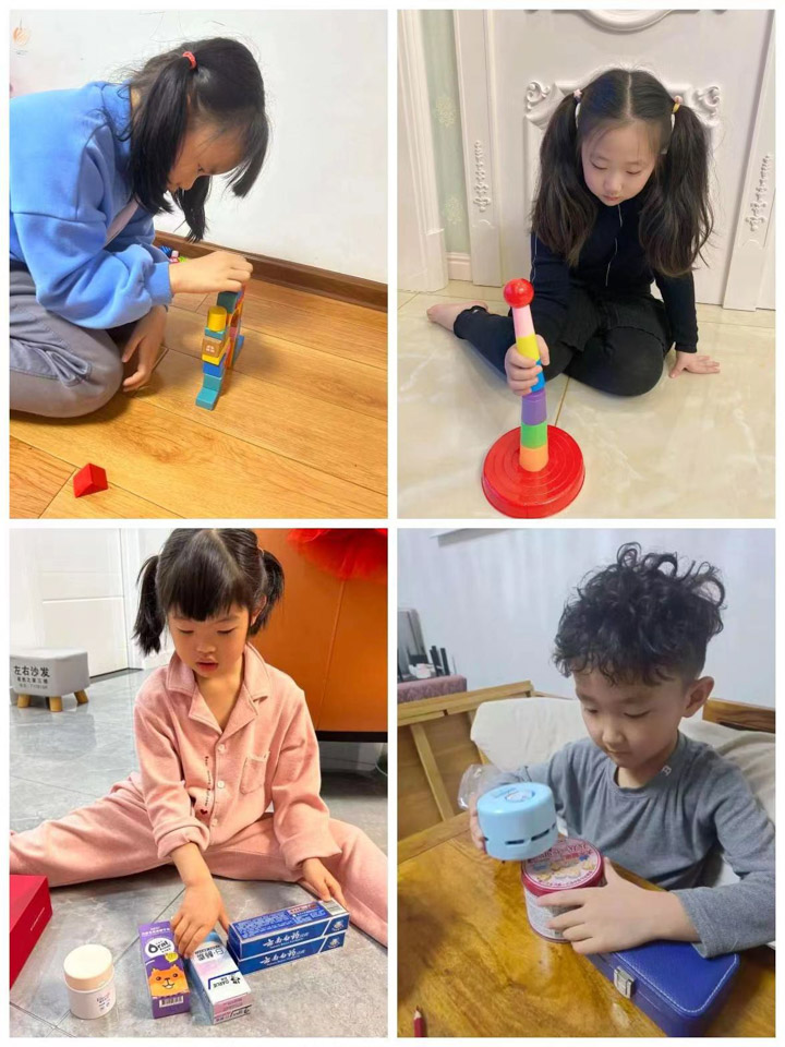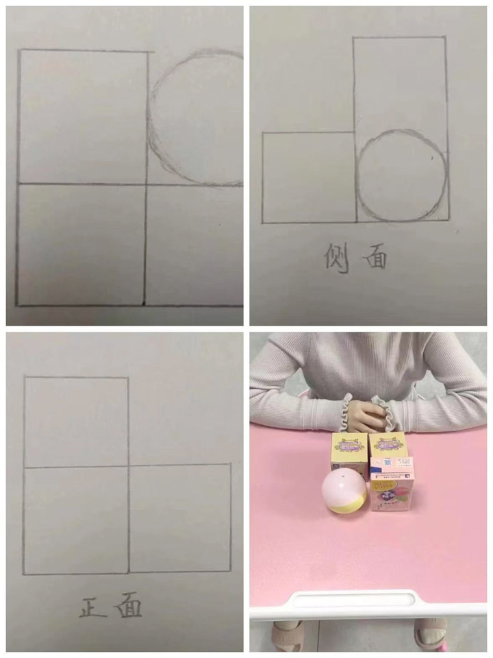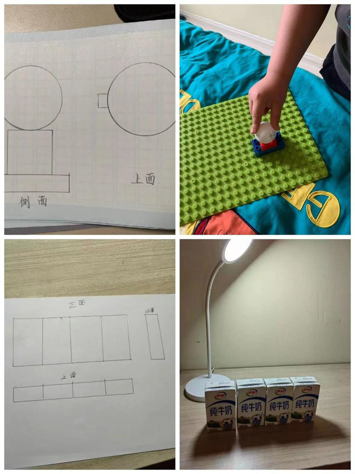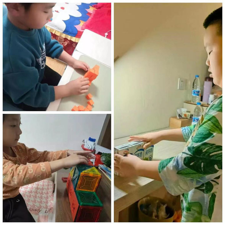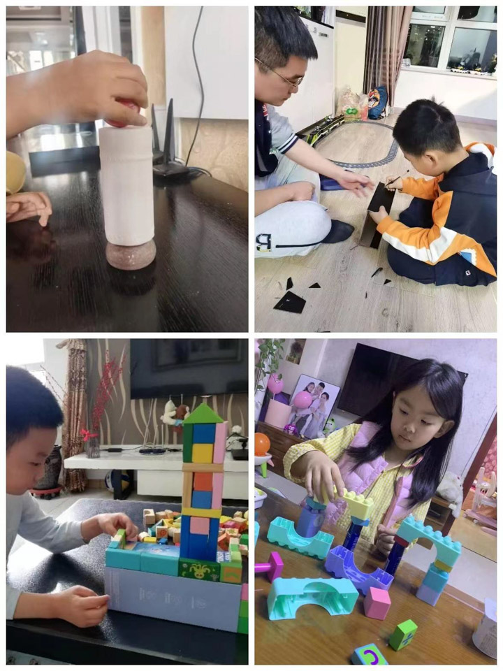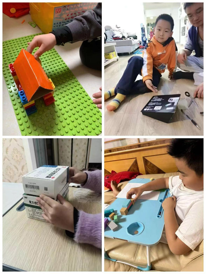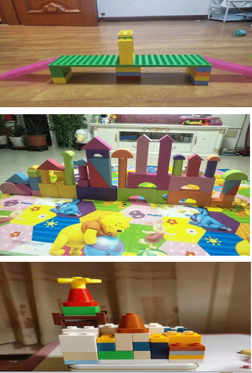 根据活动的设计,孩子们接受了来自爸爸妈妈的小挑战。爸爸妈妈提前画出的从不同角度看到的图,孩子们来进行实物的拼搭。此活动没有难倒他们,反而越战越勇,孩子们的空间想象能力得到了充分地锻炼!