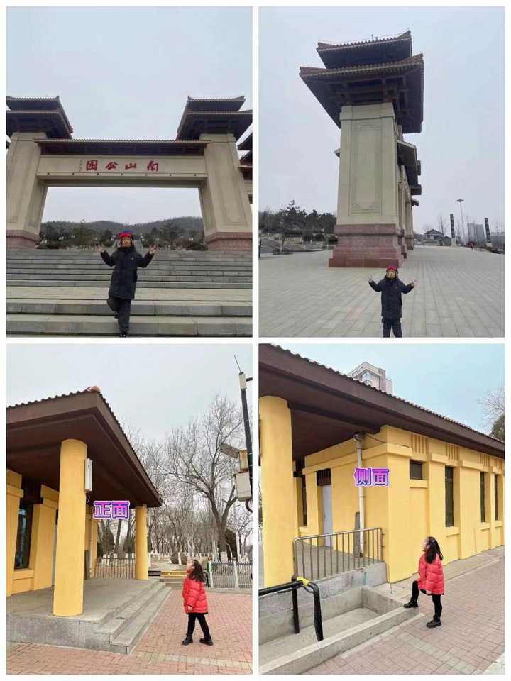 在观察建筑物的时候,孩子们提出了各种各样的问题:“南山公园大门石头柱子顶上的红色瓦块叫什么?”“为什么古建筑的房屋檐角是翘起来了的?”“张老师,这么大的建筑物是怎么运过来了的?”面对孩子的问题,家长和老师认真解答,孩子们了解到了很多书本上看不到的知识。