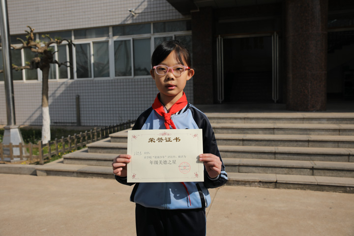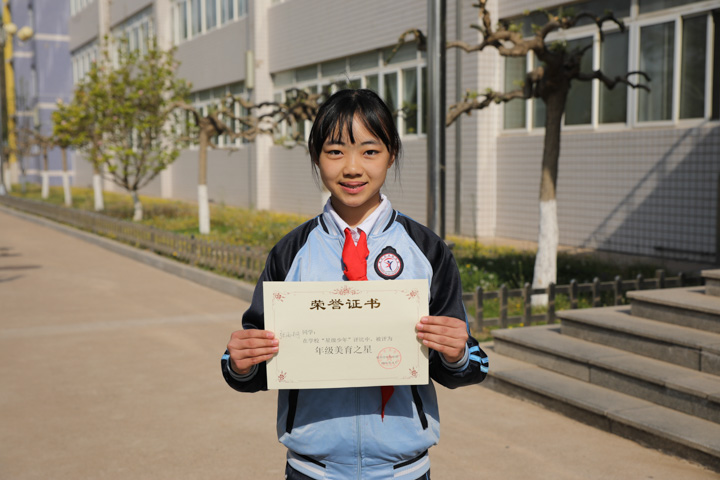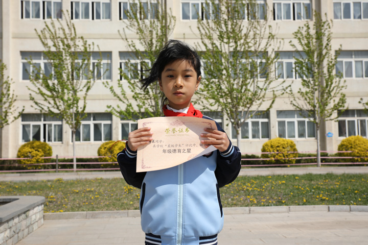 她是个朴实、乐观的孩子,小小的身躯,却似有无穷的力量。她尊敬师长,团结同学,成绩稳定。在学校,她是老师的小帮手,尽职尽责做好每一件小事;在家里,她孝敬长辈,帮助父母做力所能及的家务!她如一颗璀璨的星星,闪烁着积极向上的耀眼光芒!她就是三年二十四班的美德之星——王懿晨。