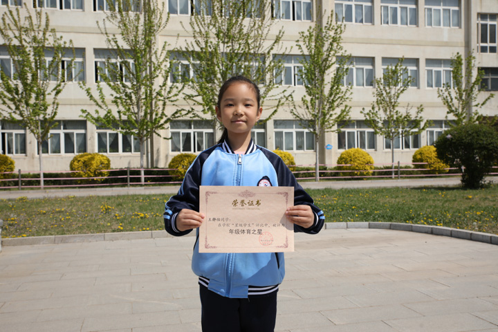 她是一个乐观向上的女孩!在校期间积极参加各项组织活动,多次为班级争取荣誉,曾经在校运动会上获得过5年组400米女子第一名!她想对大家说:体育兴,则国兴!体育强,则国强!她就是五年二班的体育之星——王馨瑶!