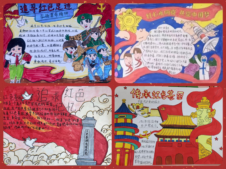 描绘红色画作组的同学们,绘制了精美的以“追寻红色印记”为主题的手抄报作品,同学们纷纷拿出画笔,围绕锦州各个历史时期的经典场景、英雄人物、红色地标、革命文化、城市变迁发展等画面,将自己心中最具代表性的红色印记跃然纸上,绘画小组同学发挥各自特长,选取喜爱的角度,用手中的画笔抒发对祖国的热爱!在创作过程中体会今天的幸福生活来之不易,我们要学会珍惜,学会感恩,要热爱共产党,热爱新中国。