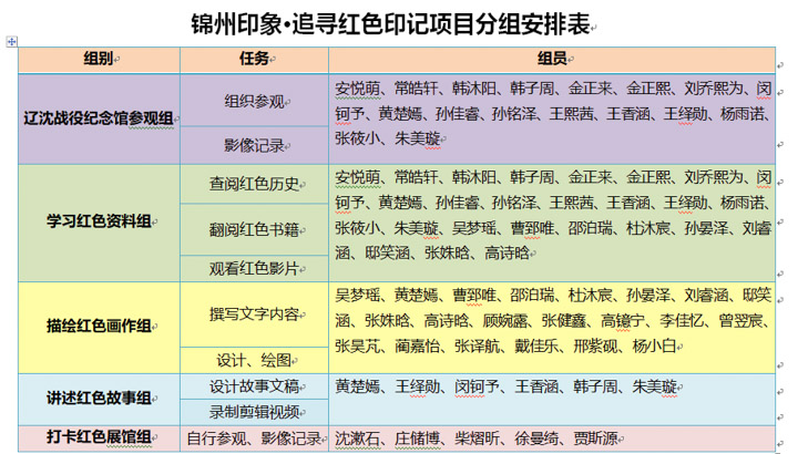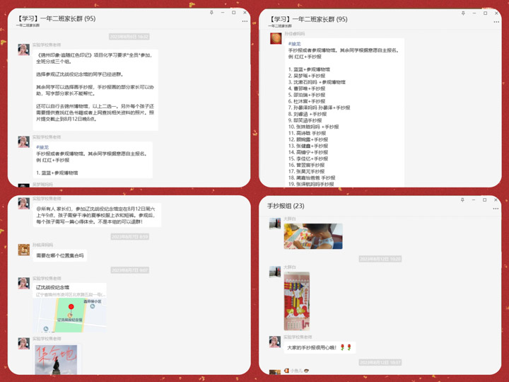 项目化学习团队根据红色印记展现形式,分为5个学习小组,分别是辽沈战役纪念馆参观组、学习红色资料组、描绘红色画作组、讲述红色故事组、打卡红色展馆组,并分别建立了微信群,孩子们进一步明确了主题式项目化学习的实施流程,制定项目安排计划表,细化责任分工,在群内同学们各自发挥特长,相互借鉴交流,学习气氛浓郁。