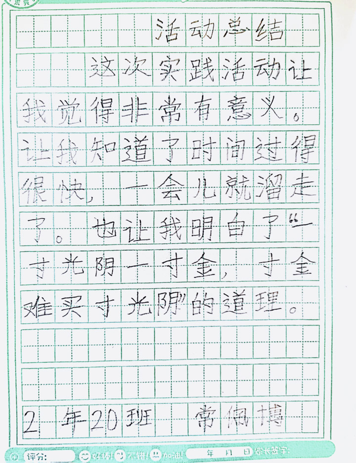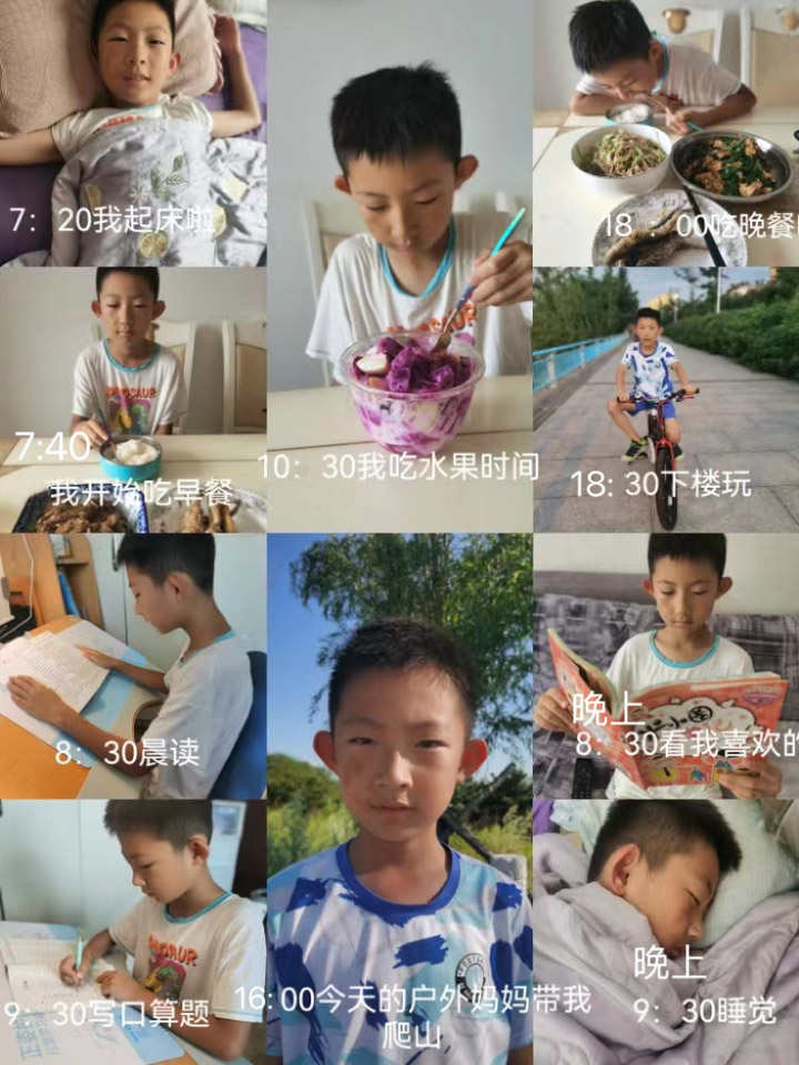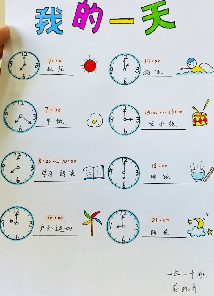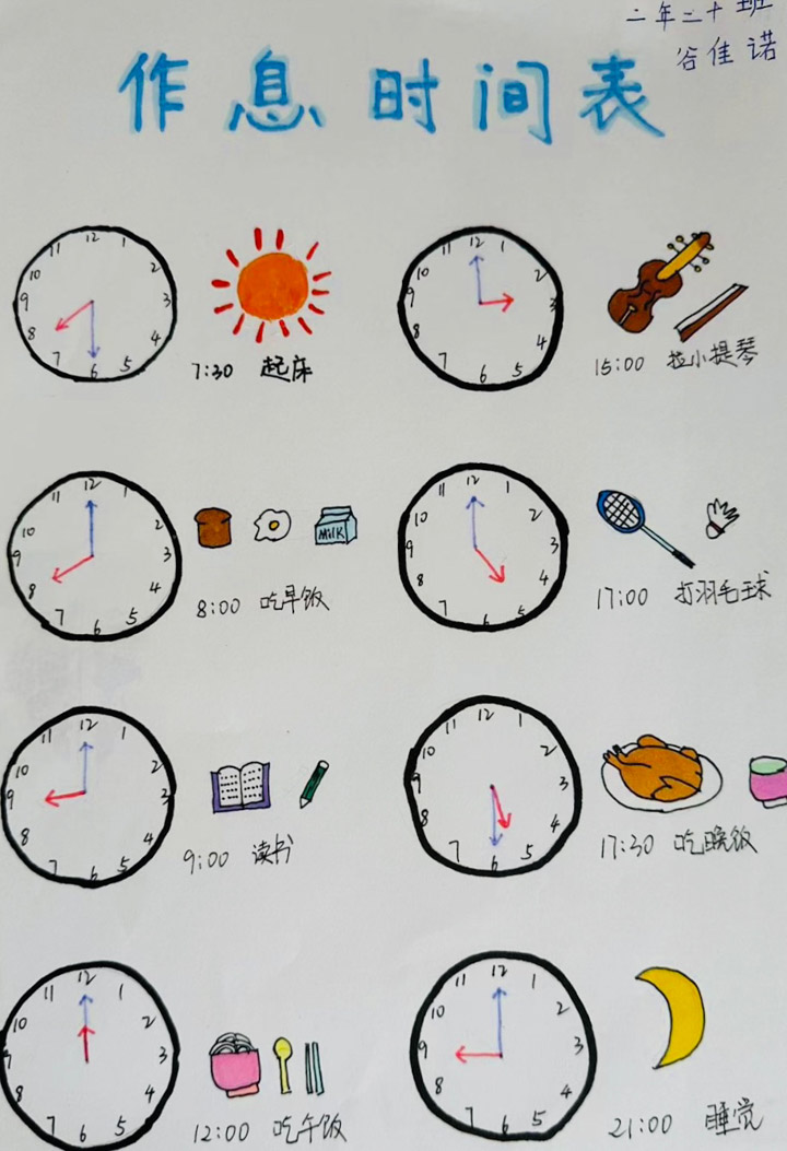 “一寸光阴一寸金,寸金难买寸光阴。”为了让同学们在暑假更加合理、有效地分配时间,自主管理好自己的一日活动,同时根据时间安排,与课本上的时、分、秒知识点相结合,进而对时间有更准确、更深刻的认识,二年级20班开展了《小小时间规划师》实践活动。