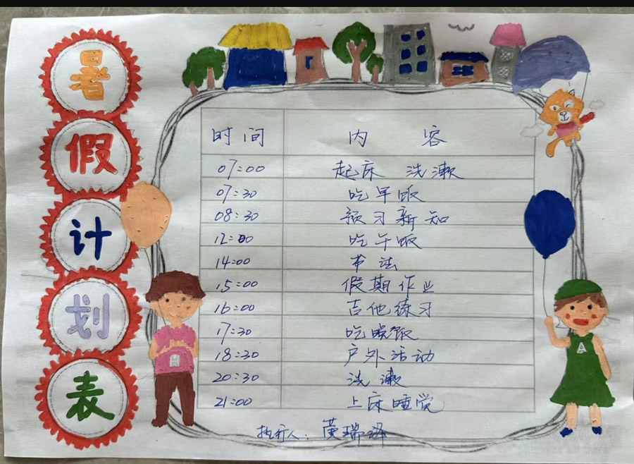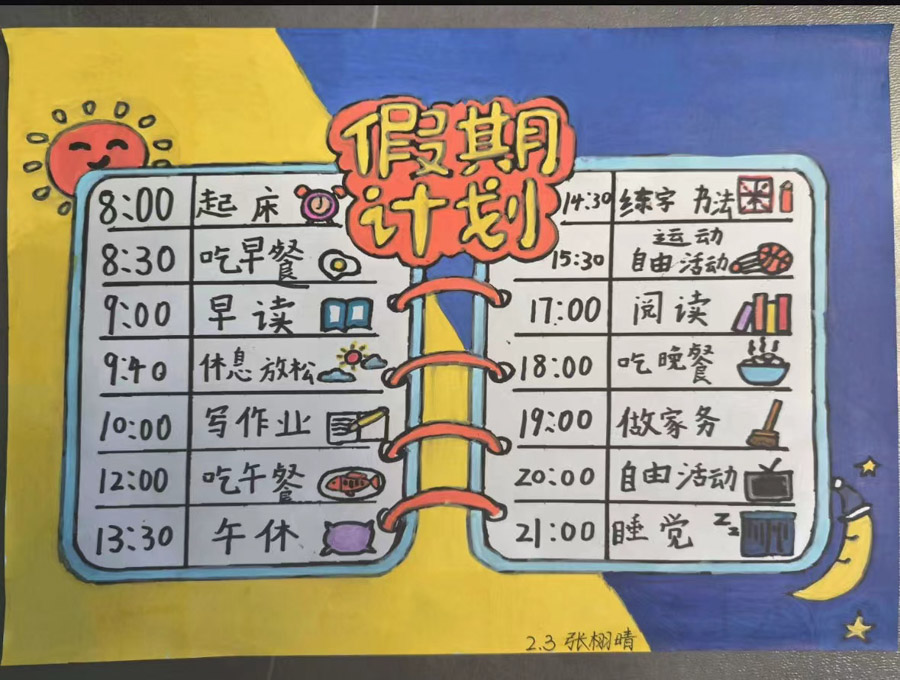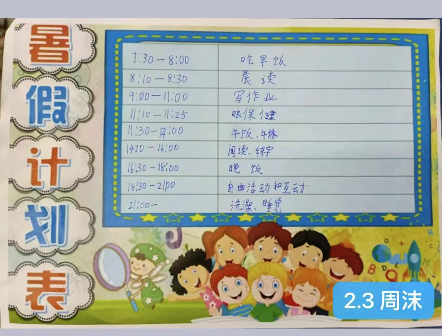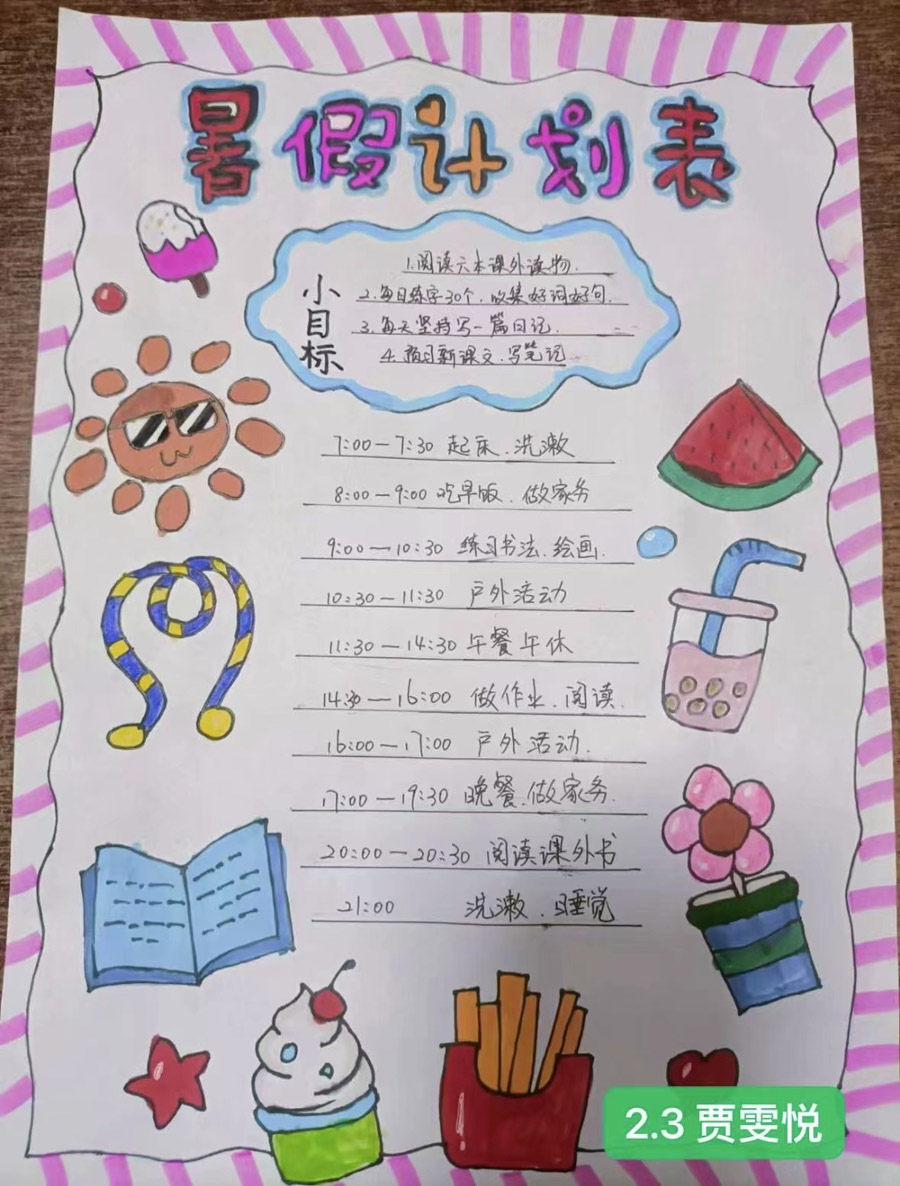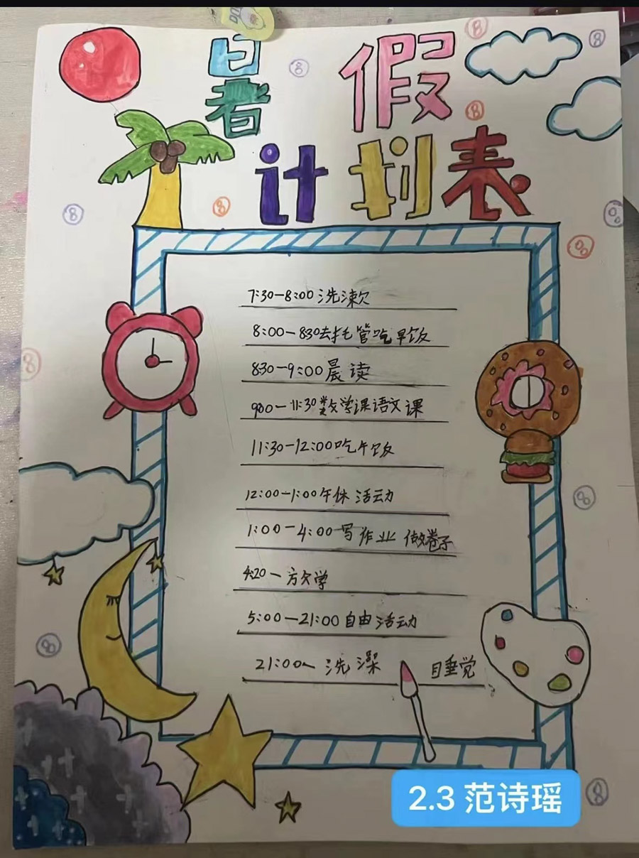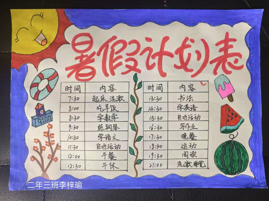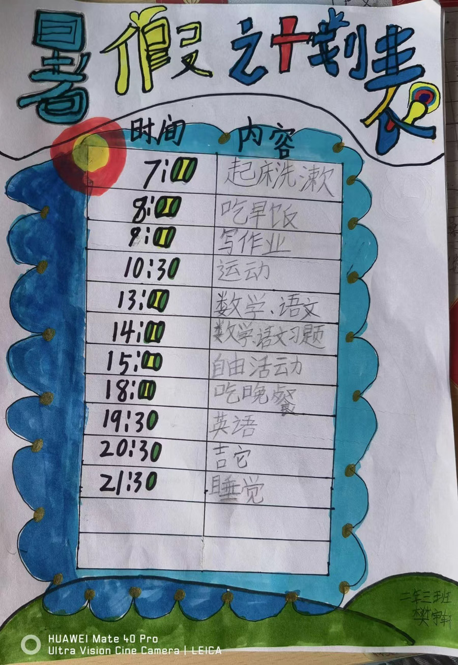 盛年不重来,一日难再晨。二年级的我们也要开始学习做时间的小主人,有规划地利用时间了。暑假生活已全面开启,2022级3班班主任王子维老师为了引导同学们过一个充实而有意义的假期生活,以“做时间的小主人”为主题开展了一次充满数学魅力的学科实践活动。孩子们用一份份精心设计的暑期计划,开启了假期自我规划和自主管理的序幕。