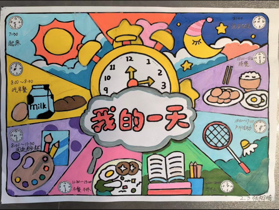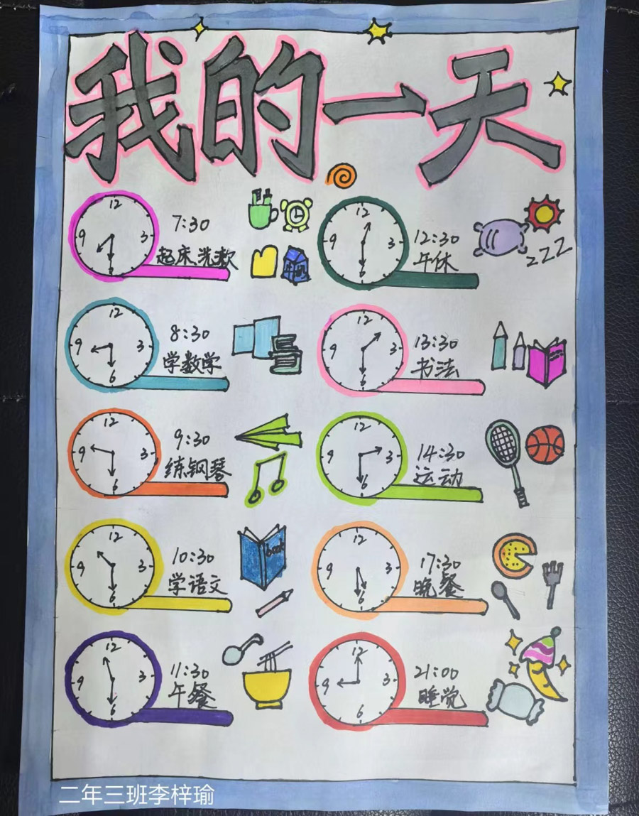 时间是长河,一路向前不复返。为了让同学们在暑假更加合理、有效地分配时间,同时与课本上的时、分、秒知识点相结合,进而对时间有更准确、更深刻的认识,二年三班开展了《做时间的小主人》实践活动。