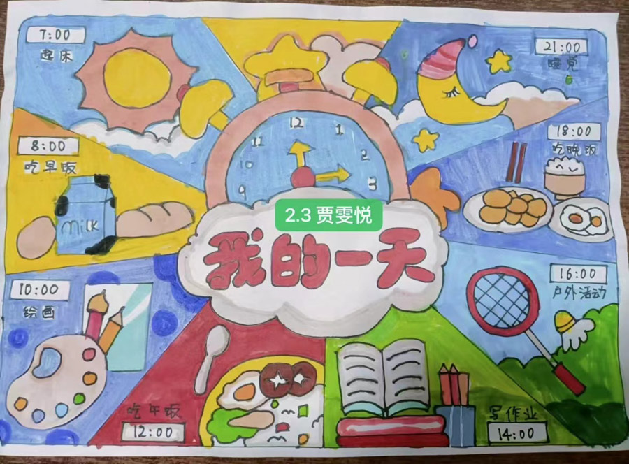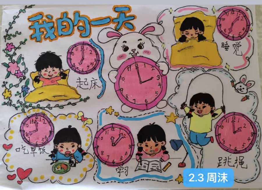 学用结合,做时间的小主人。孩子们用图画、文字、表格等方式把时间和自己的一天作息相结合,进行合理创作。通过用时间记录生活和学习,进一步巩固了“认识时间”的知识,同时增强了孩子们惜时守时的意识。