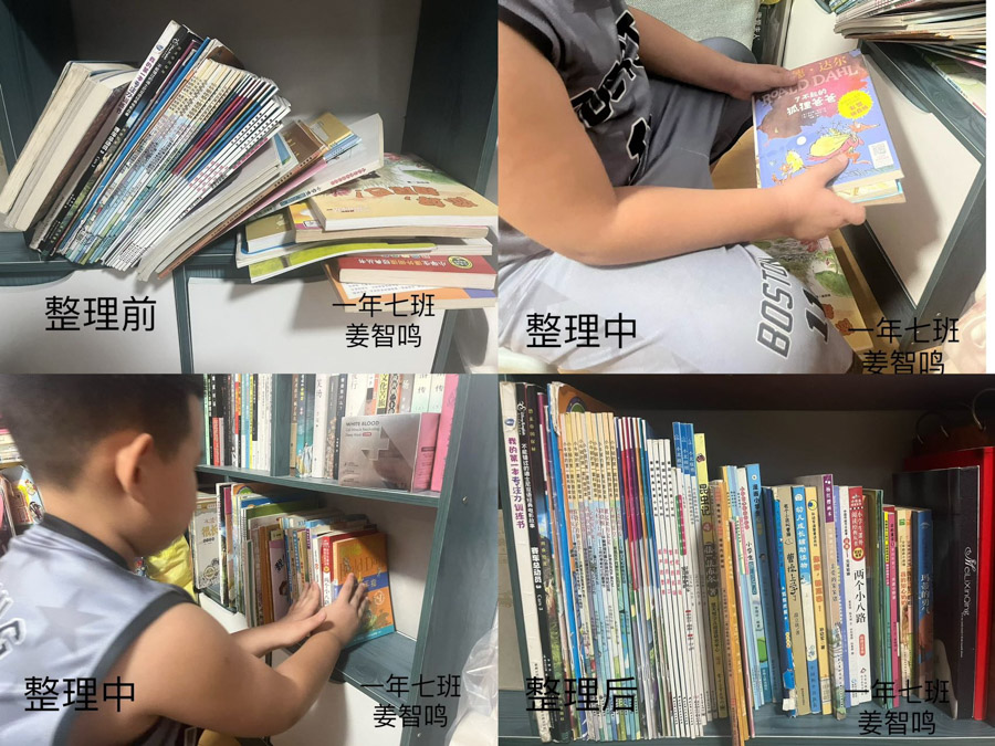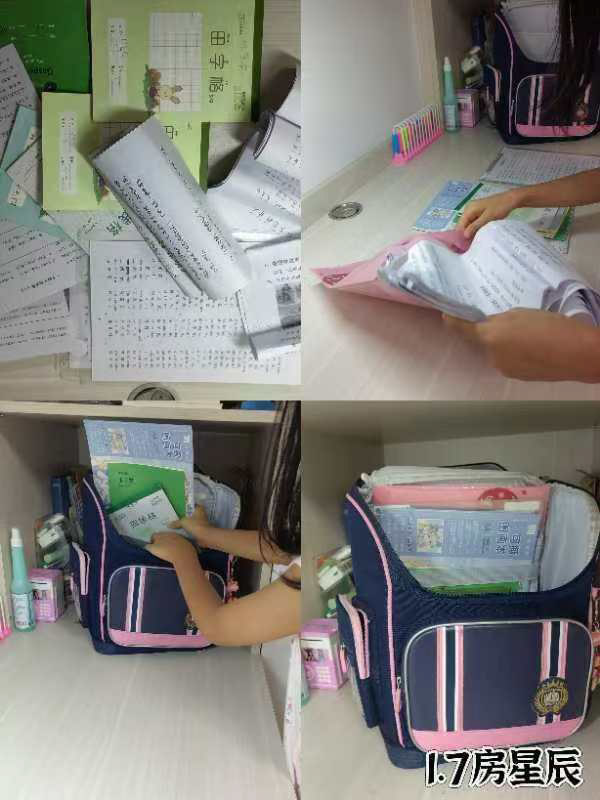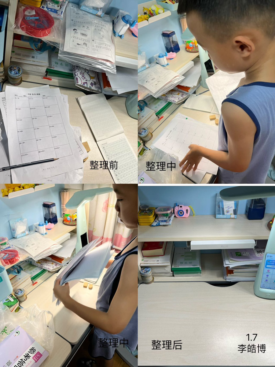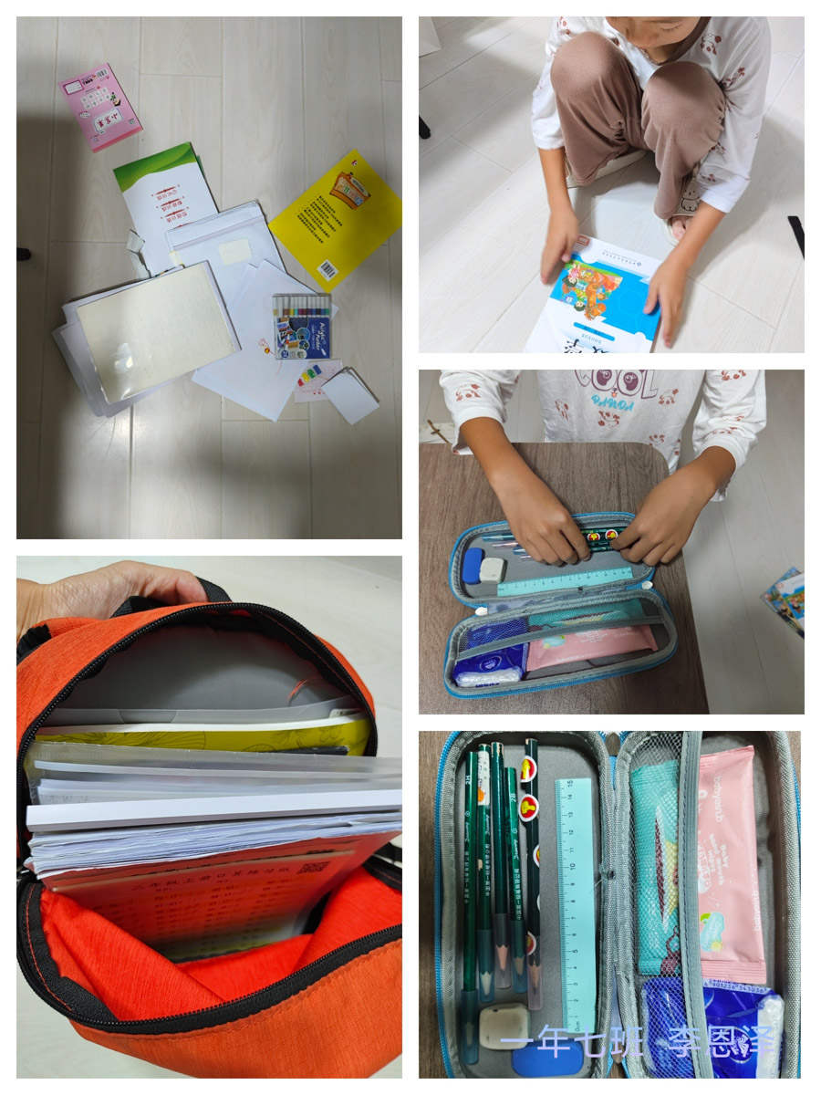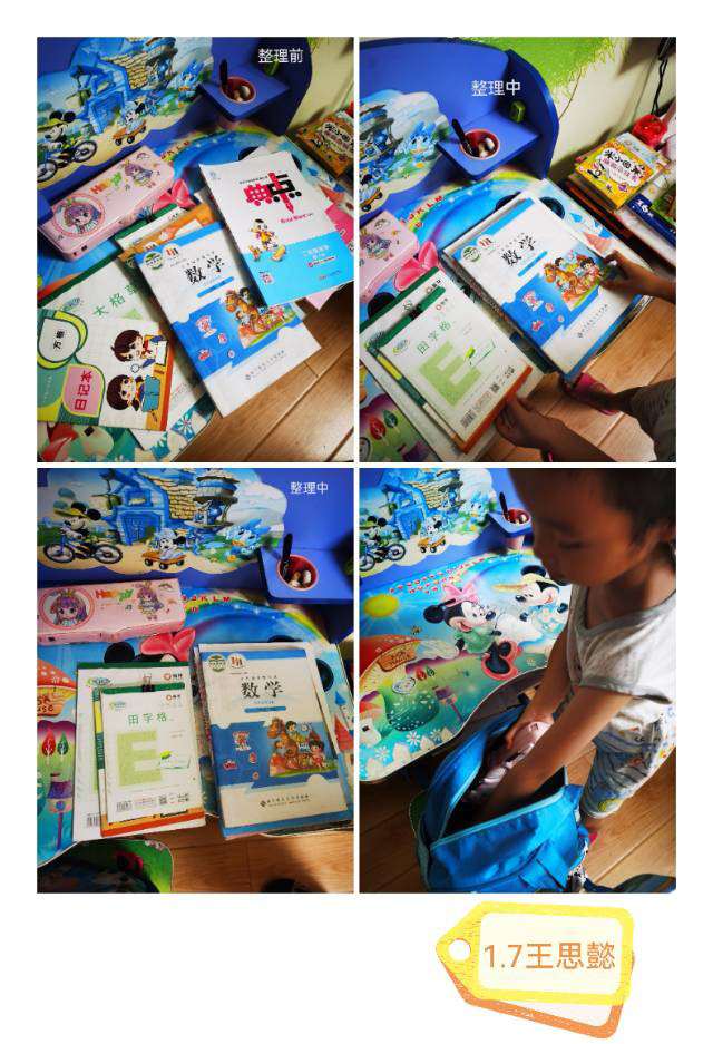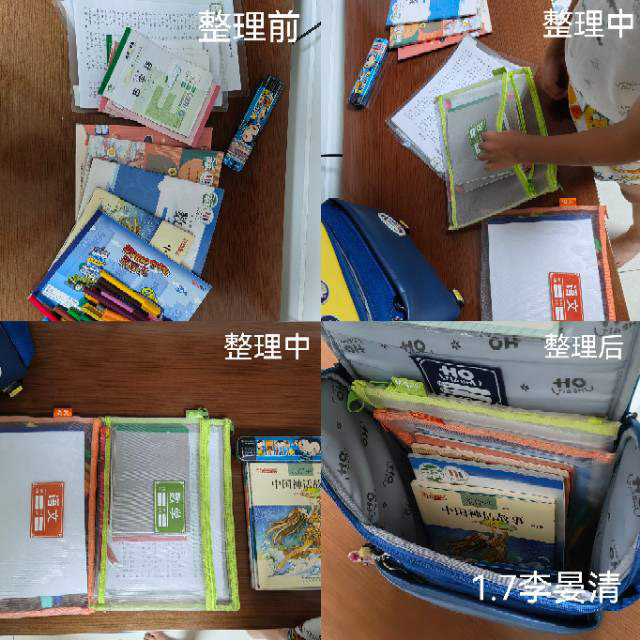 为了使学生体会到数学就在身边,领悟到数学的魅力,感受到数学的乐趣,在一年级的孩子们学习了《分类》后,老师布置了实践作业:请你将自己的书桌、书包、衣服等,按照你喜欢的标准进行分类吧!再按一定的顺序整理好,让它们看起来更整洁美观,并请爸爸妈妈拍照记录下整理前和整理后的样子。