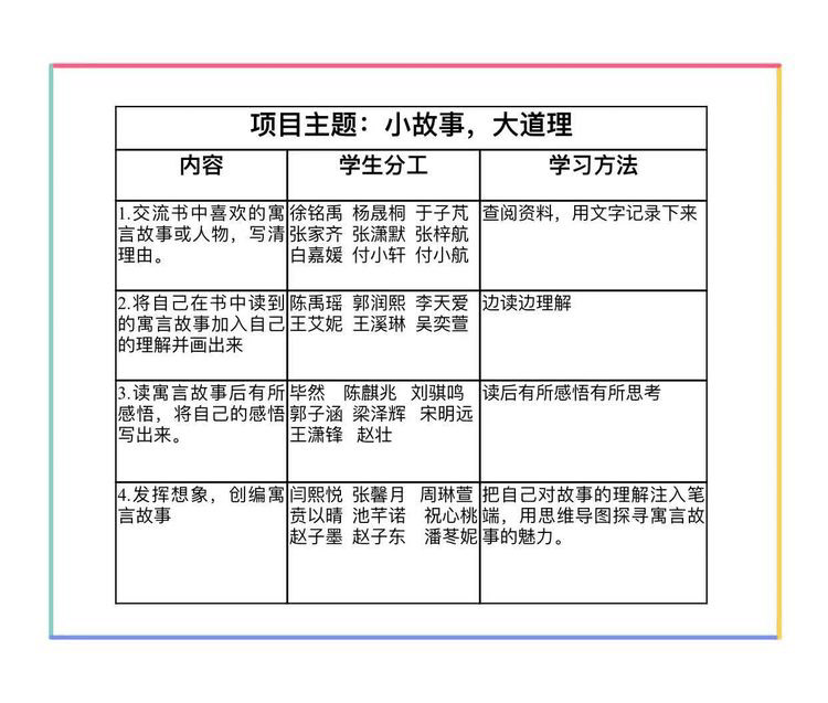 基于寓言主题的项目化学习是一个启发孩子们提问、思考、研究、总结的实践活动,是一个教会孩子自主阅读、自主学习的实践活动。通过本次学习活动,孩子们读寓言、讲寓言、研寓言、画寓言,创编寓言,更加深入地学习寓言故事,更加深刻地把握其中道理,更加清晰地领悟人生哲理。