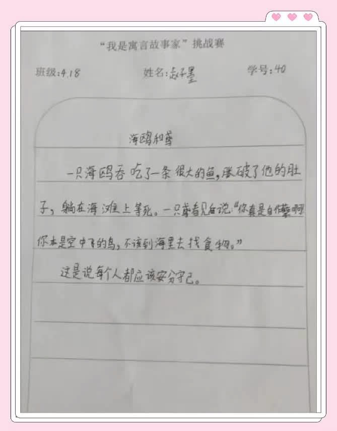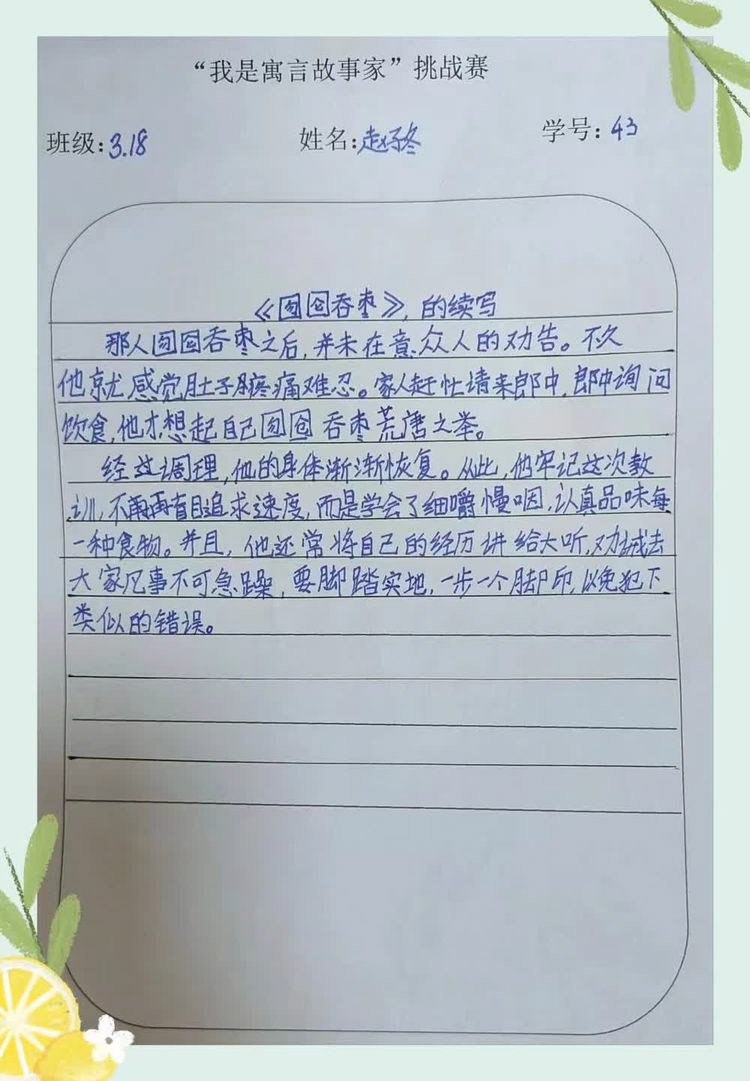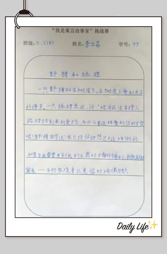 著名儿童文学家严文井曾说:“寓言是一个魔袋,袋子很小,却能从里面取出很多东西来……"虽然寓言故事一般比较短小,但背后往往蕴藏着深刻的道理。我们用他们稚嫩的语言,书写着对故事的理解,打开了心灵之门。