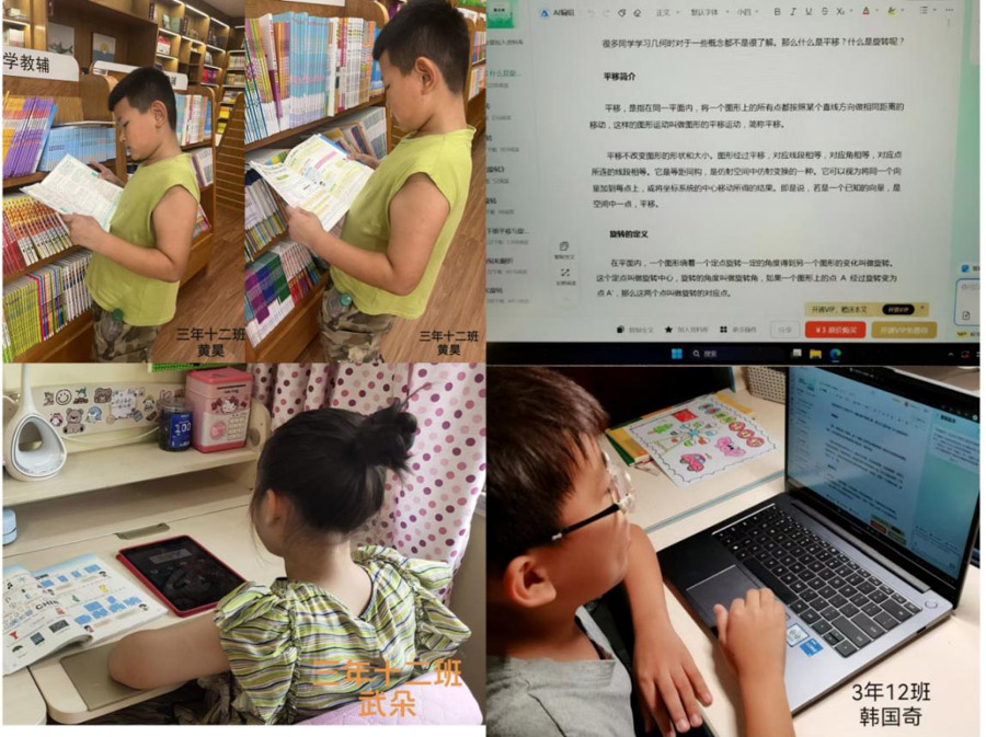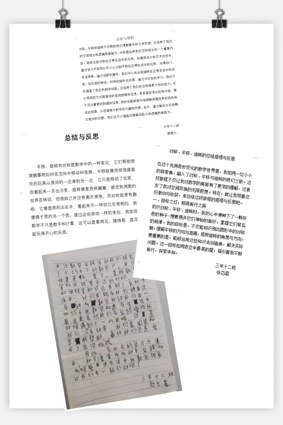 同学们用自己喜欢的方式自主学习,有的上网查阅资料,有的翻看书籍,还有的向长辈请教。多元化的学习方式有助于他们更全面地理解知识,并且从不同的角度和渠道获取信息。这样的学习方式不仅有助于提高学习效果,还能培养他们的自主学习能力和探索精神,通过查阅资料对对称、平移和旋转有了更深的认识和理解。