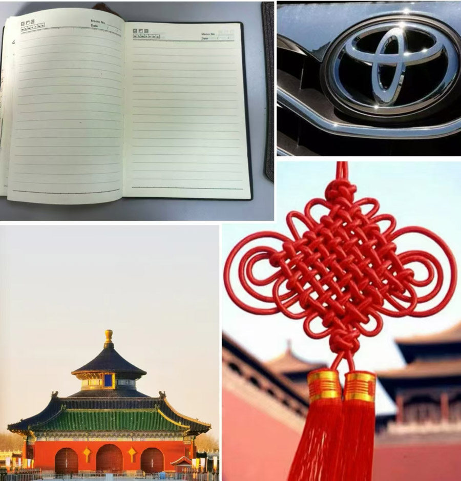 陈梓萱、张艺馨、杨东泽、武朵同学,通过观察发现汽车标志、笔记本、以中国结及一些建筑都是对称图形。