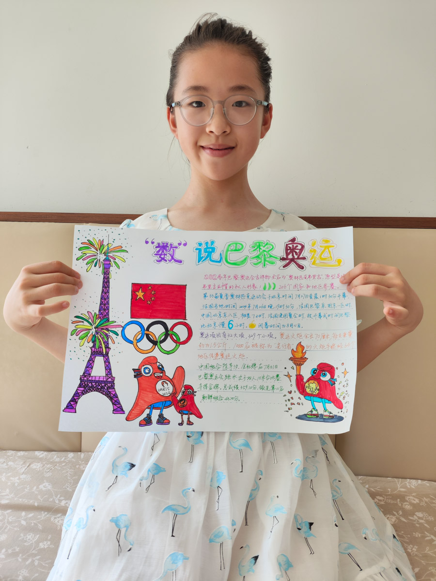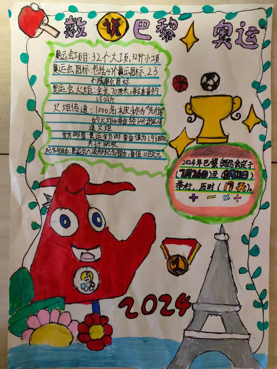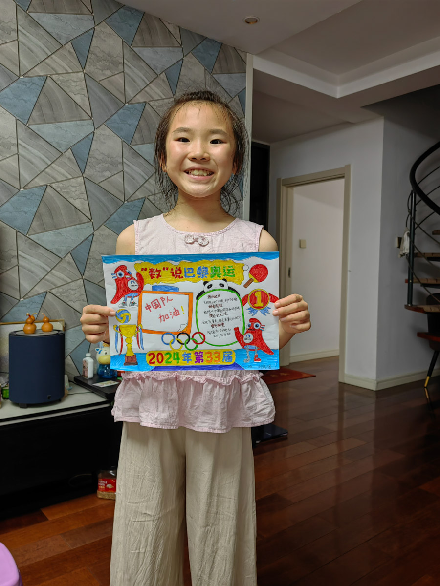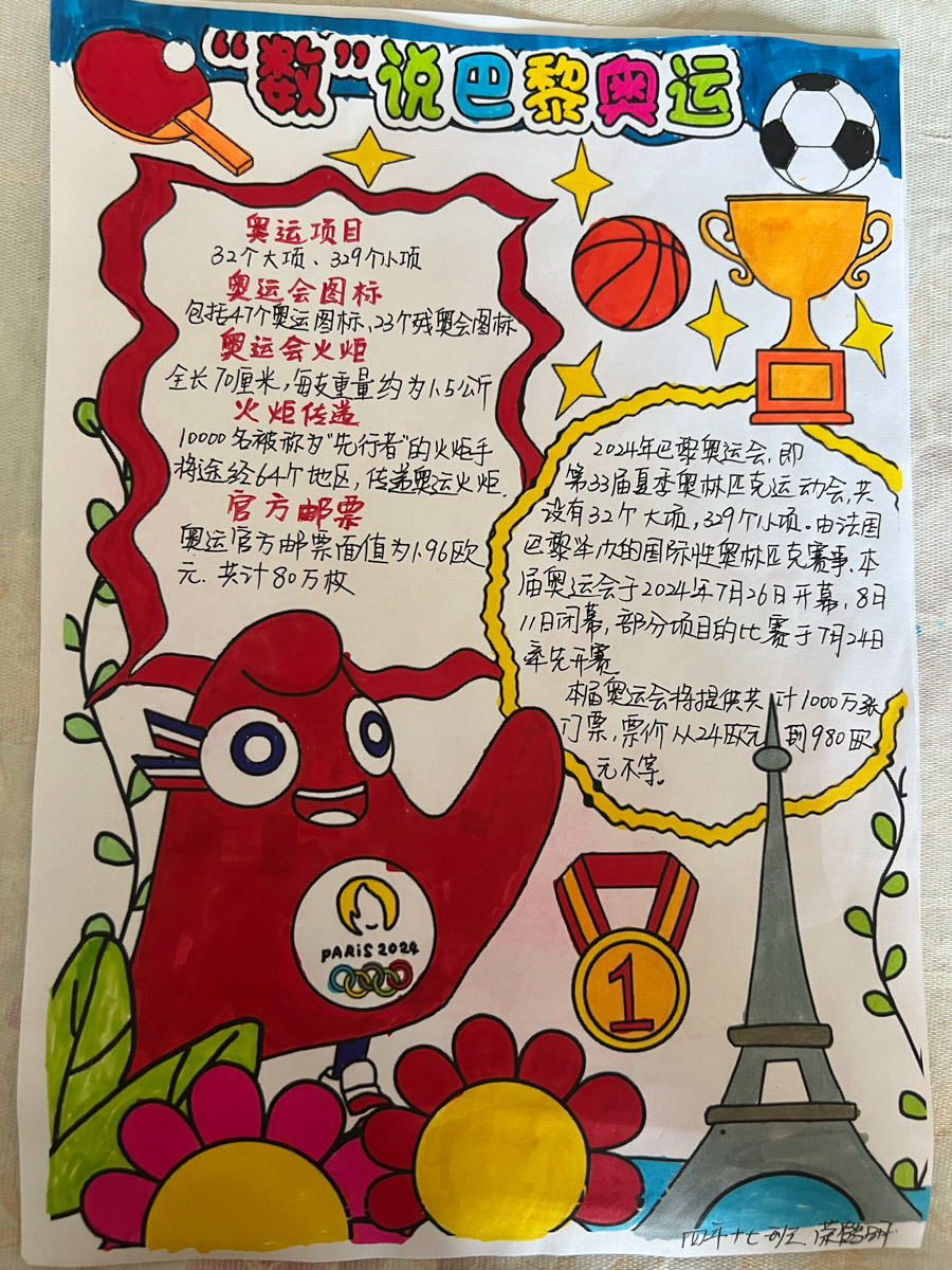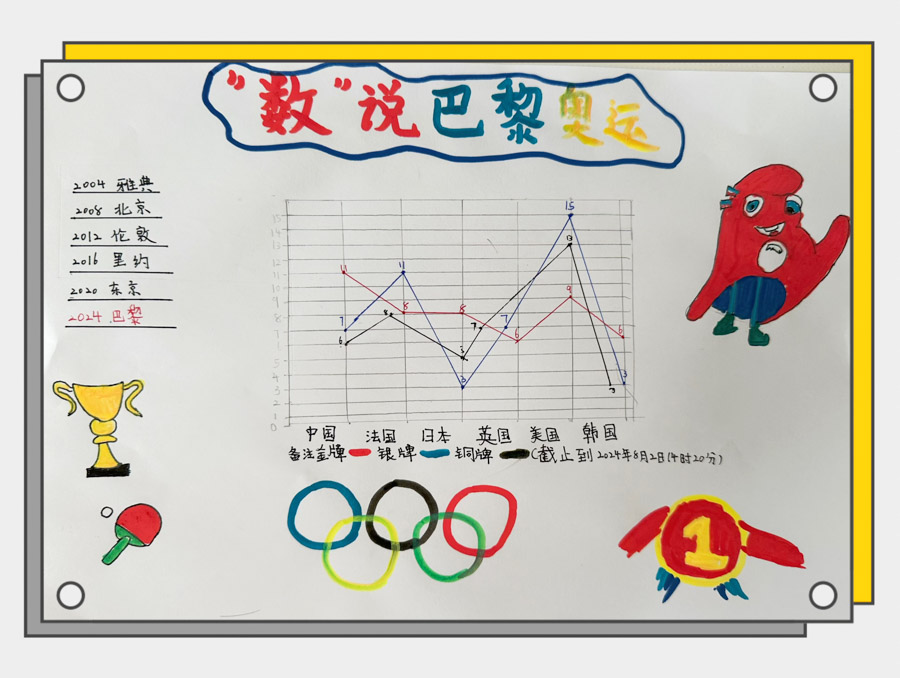 本次巴黎奥运会,中国健儿们已赛出佳绩!孩子们也增长了和奥运相关的知识,通过孩子们用一系列的文字、数字和统计图的探索奥运知识的展示,让我们对奥运会有了更深刻的认识,孩子们也会继续努力学习数学知识,用自己的实际行动继续为祖国健儿们,加油助威!