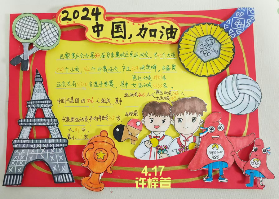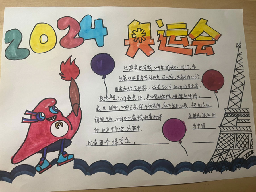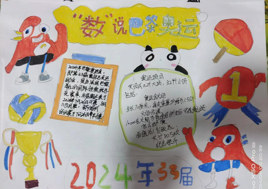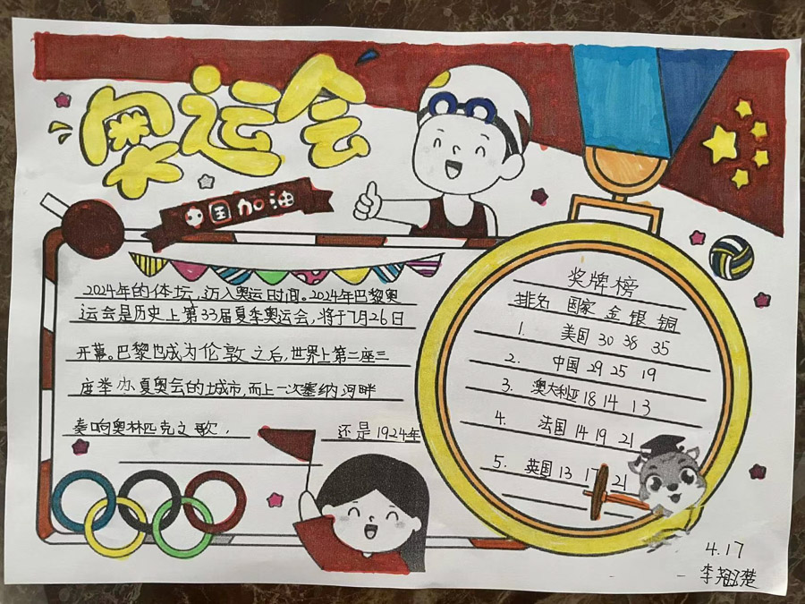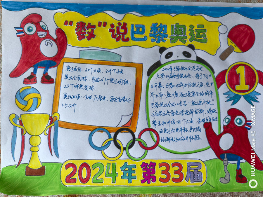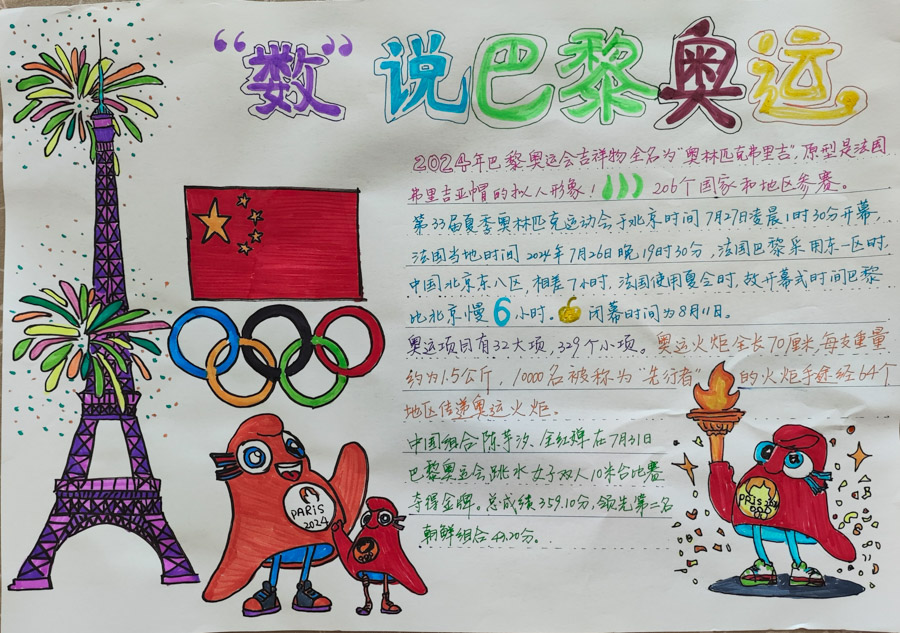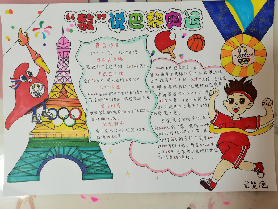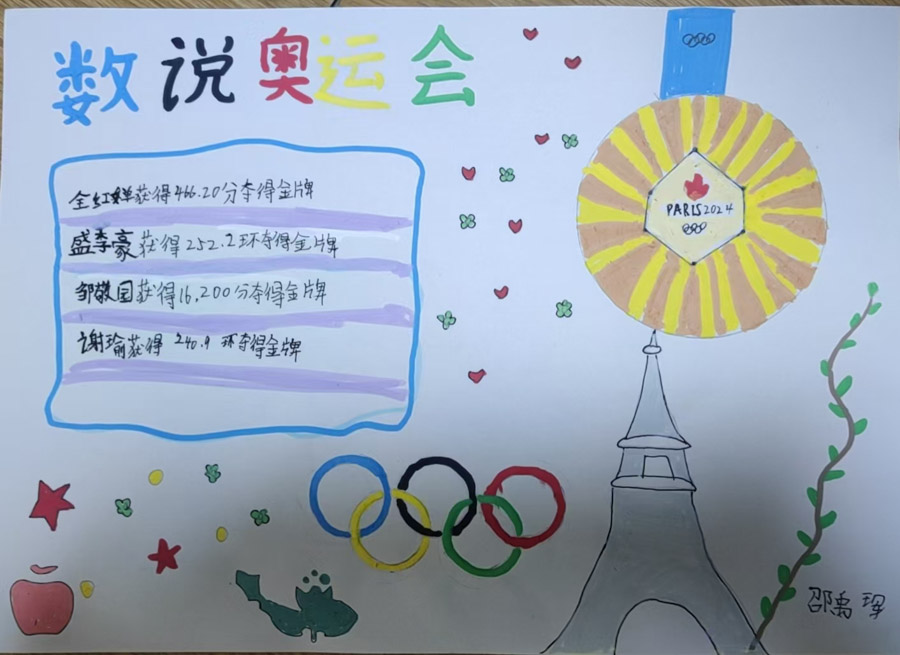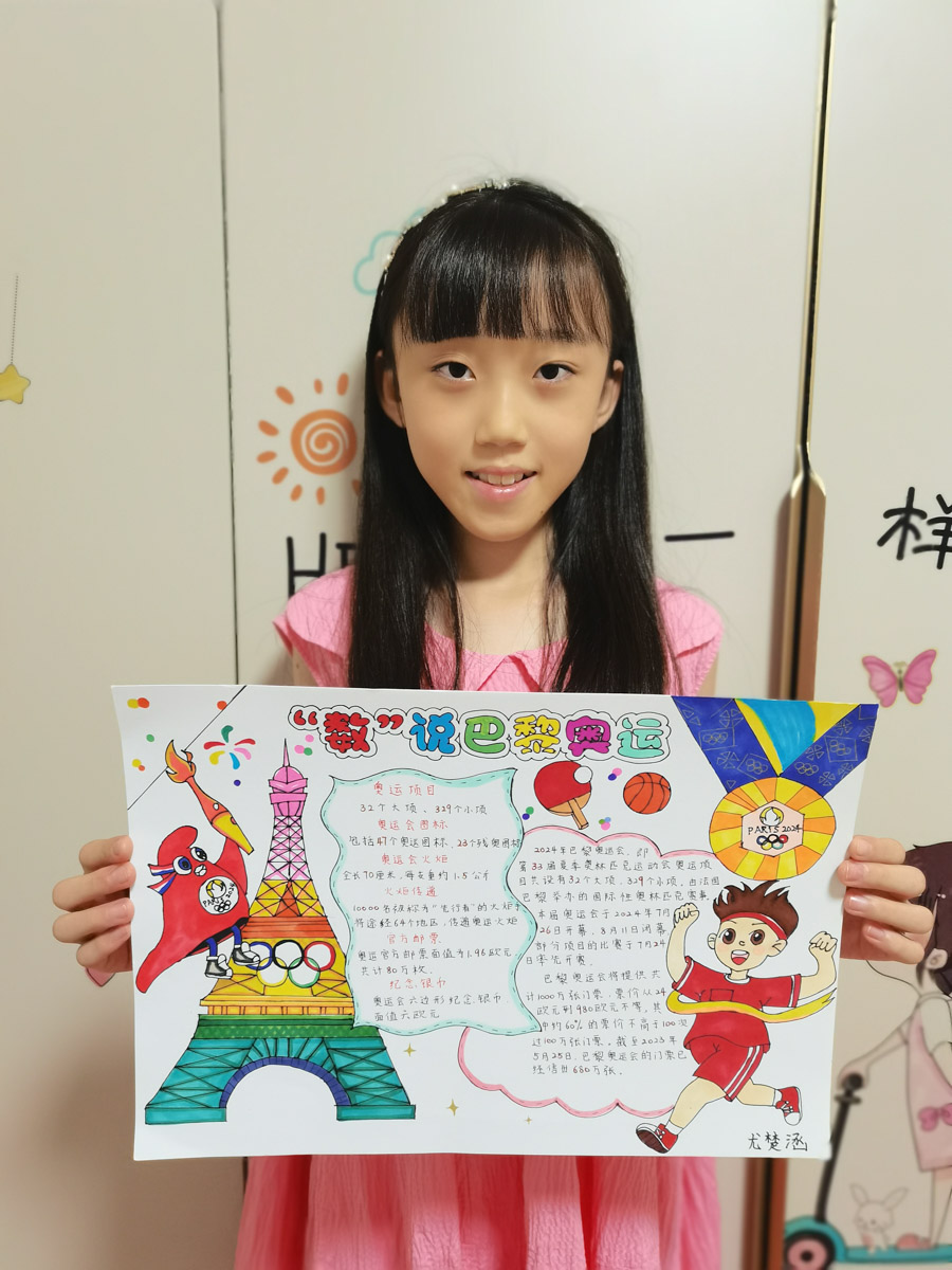 本次巴黎奥运会,中国健儿们已赛出佳绩!孩子们也增长了和奥运相关的知识,通过孩子们用一系列的文字、数字和统计图的探索奥运知识的展示,让我们对奥运会有了更深刻的认识,孩子们也会继续努力学习数学知识,用自己的实际行动继续为祖国健儿们,加油助威!