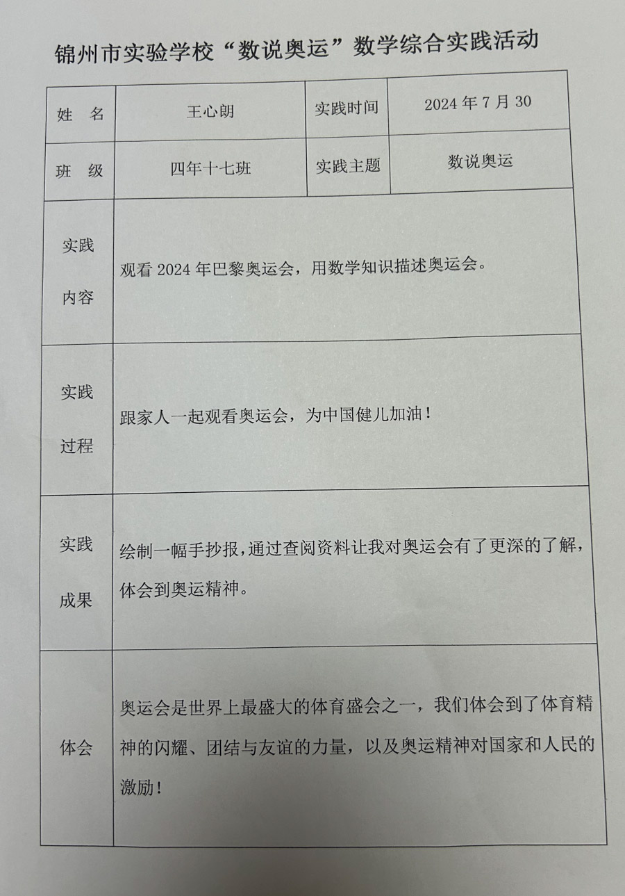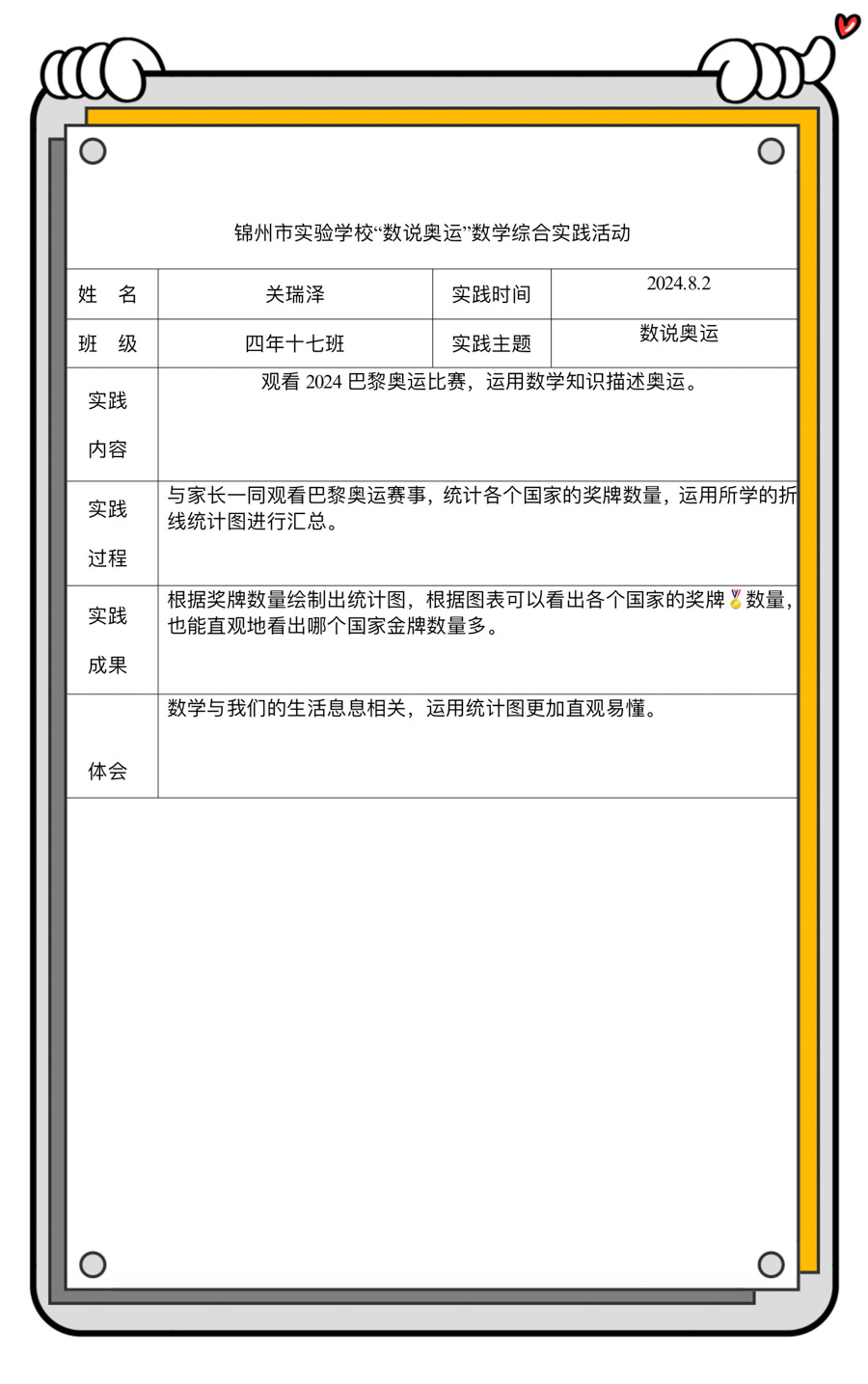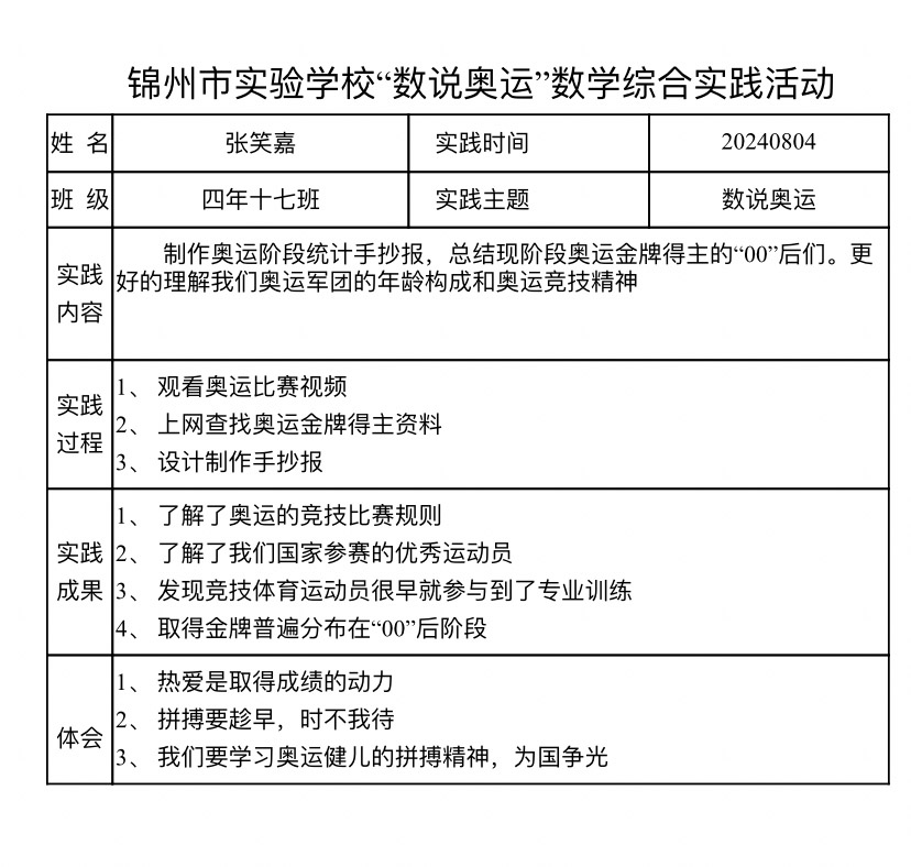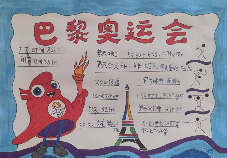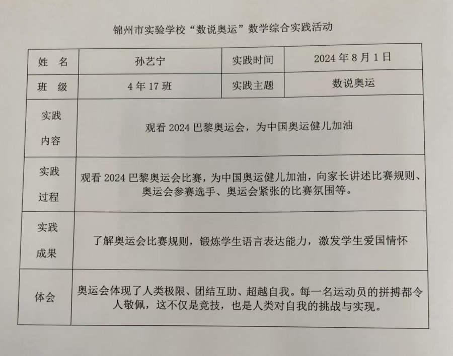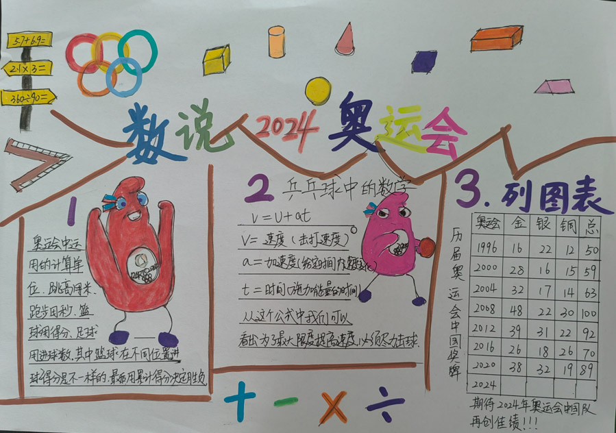 本次巴黎奥运会,中国健儿们已赛出佳绩!孩子们也增长了和奥运相关的知识,通过孩子们用一系列的文字、数字和统计图的探索奥运知识的展示,让我们对奥运会有了更深刻的认识,孩子们也会继续努力学习数学知识,用自己的实际行动继续为祖国健儿们,加油助威!