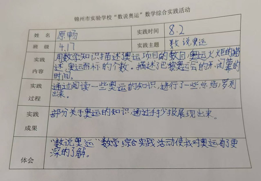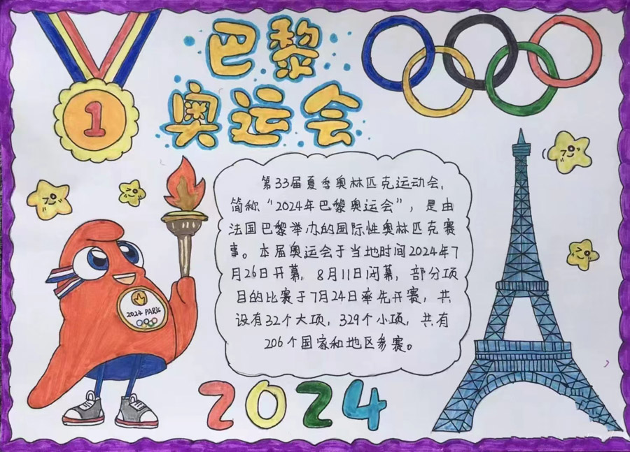 2024年奥运会在法国巴黎拉开帷幕,全球的目光将再次聚焦于这一体育盛事,法国巴黎给大家的印象除了“自由浪漫”以外,其实还有“数学”。除了比赛的激烈,巴黎还有“理性与感性交织的数学浪漫”。奥运会不仅仅是体育竞技的舞台,更是一个展示数学思维和应用的绝佳机会。在本次主题实践活动中,学生在学习了《奥运中的数学》的基础上,观看2024巴黎奥运会,制作手抄报、争当小小奥运主持人、制作小视频,为中国奥运健儿加油。